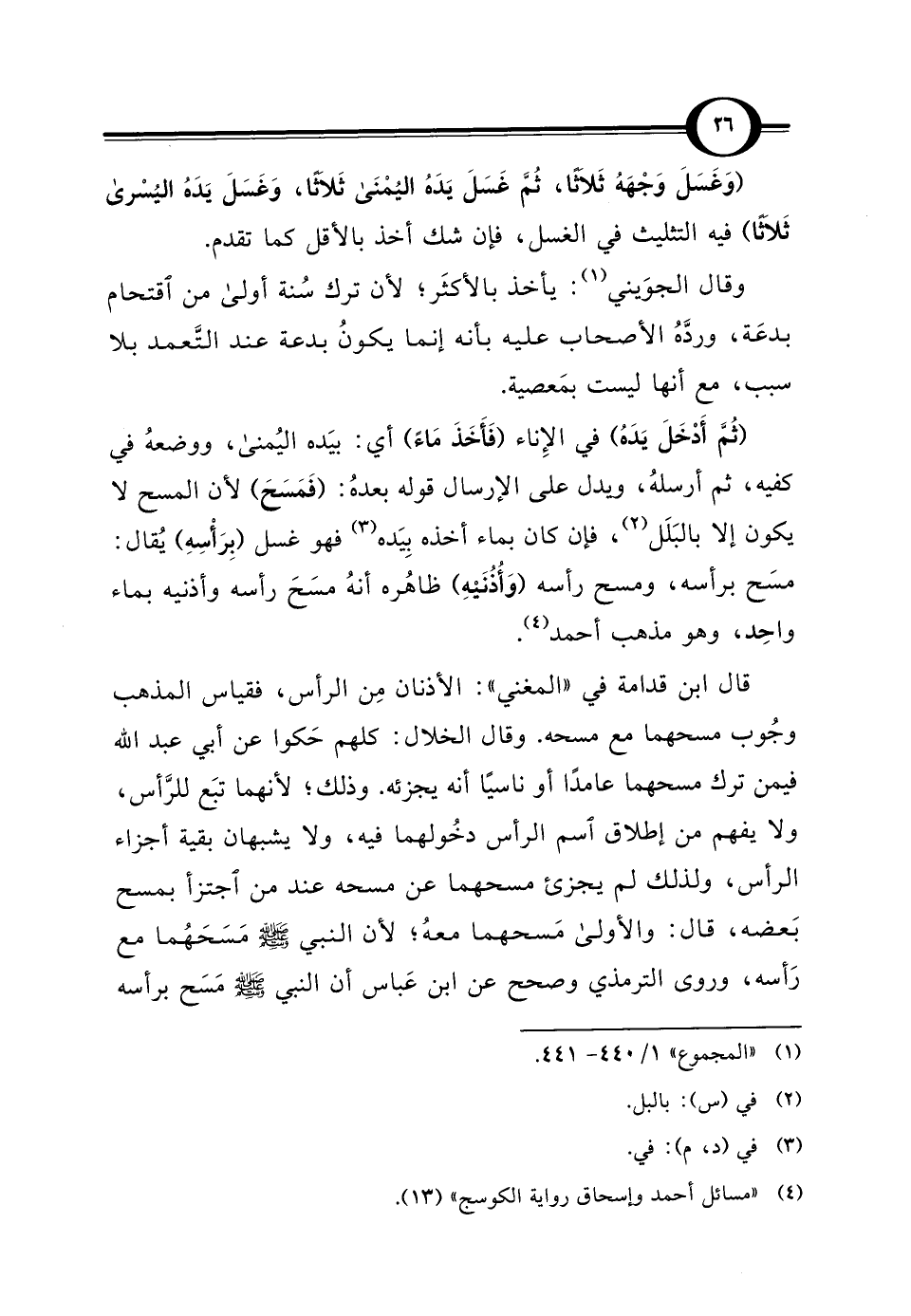قال ابن قدامة في "المغني": الأذنان مِن الرأس، فقياس المذهب وجُوب مسحهما مع مسحه. وقال الخلال: كلهم حَكوا عن أبي عبد الله فيمن ترك مسحهما عامدًا أو ناسيًا أنه يجزئه. وذلك؛ لأنهما تبَع للرَّأس، ولا يفهم من إطلاق اسم الرأس دخُولهما فيه، ولا يشبهان بقية أجزاء الرأس، ولذلك لم يجزئ مسحهما عن مسحه عند من اجتزأ بمسح بَعضه، قال: والأولى مَسحهما معهُ؛ لأن النبي - صلى الله عليه وسلم - مَسَحَهُما مع رَأسه، وروى الترمذي وصحح عن ابن عَباس أن النبي - صلى الله عليه وسلم - مَسَح برأسه