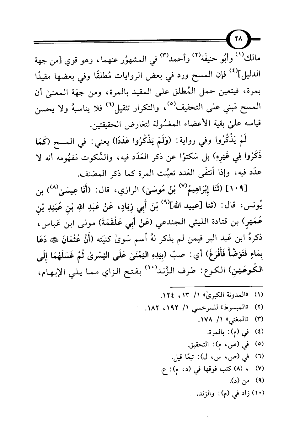 [109] (ثَنَا إِبْرَاهِيمُ (¬7) بْنُ مُوسَى) الرازي، قال: (أَنَا عِيسَى) (¬8) بن يُونس، قال: (ثنا [عبيد الله] (¬9) بْنَ أَبِي زِيَادٍ، عَنْ عَبْدِ اللهِ بْنِ عُبَيدِ بْنِ عُمَيرٍ) بن قتادة الليثي الجندعي (عَنْ أَبِي عَلْقَمَةَ) مولى ابن عَباس، ذكرهُ ابن عَبد البر فيمن لم يذكر لهُ اسم سَوى كنيَته (أَنَّ عُثْمَانَ - رضي الله عنه - دَعَا بِمَاءٍ فَتَوَضَّأَ فَأَفْرَغَ) أي: صبّ (بِيَدِهِ اليُمْنَى عَلَى اليُسْرى ثُمَّ غَسَلَهُمَا إِلَى الكُوعَينِ) الكوع: طرف الزَّند (¬10) بفتح الزاي مما يلي الإبهام،