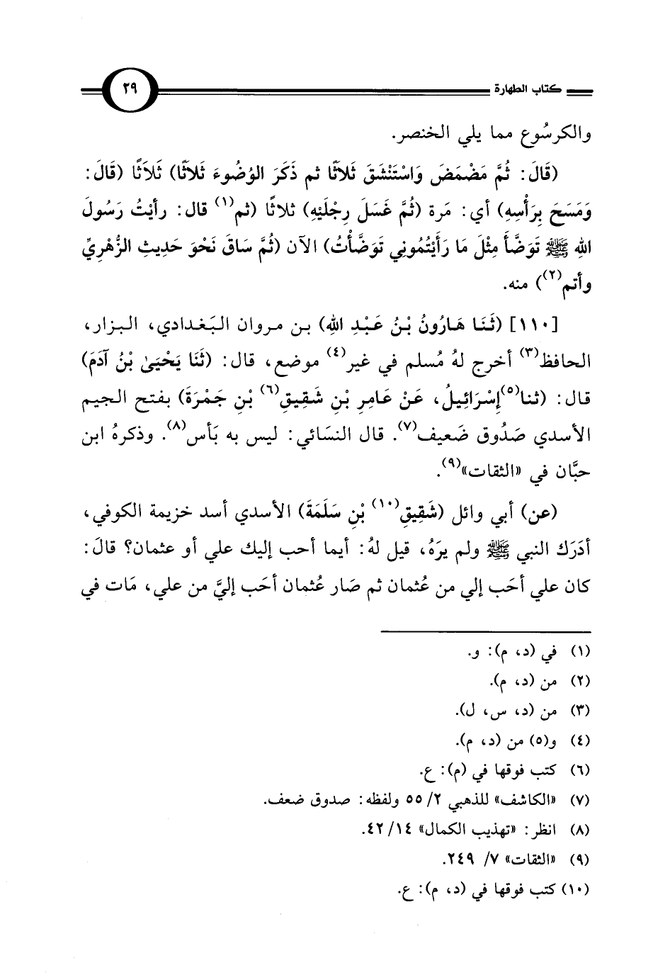 [110] (ثَنَا هَارُونُ بْنُ عَبْدِ اللهِ) بن مروان البَغدادي، البزار، الحافظ (¬3) أخرج لهُ مُسلم في غير (¬4) موضع، قال: (ثَنَا يَحْيَى بْنُ آدَمَ) قال: (ثنا (¬5) إِسْرَائِيلُ، عَنْ عَامِرِ بْنِ شَقِيقِ (¬6) بْنِ جَمْرَةَ) بفتح الجيم الأسدي صَدُوق ضَعيف (¬7). قال النسَائي: ليس به بَأس (¬8). وذكرهُ ابن حبَّان في "الثقات" (¬9).