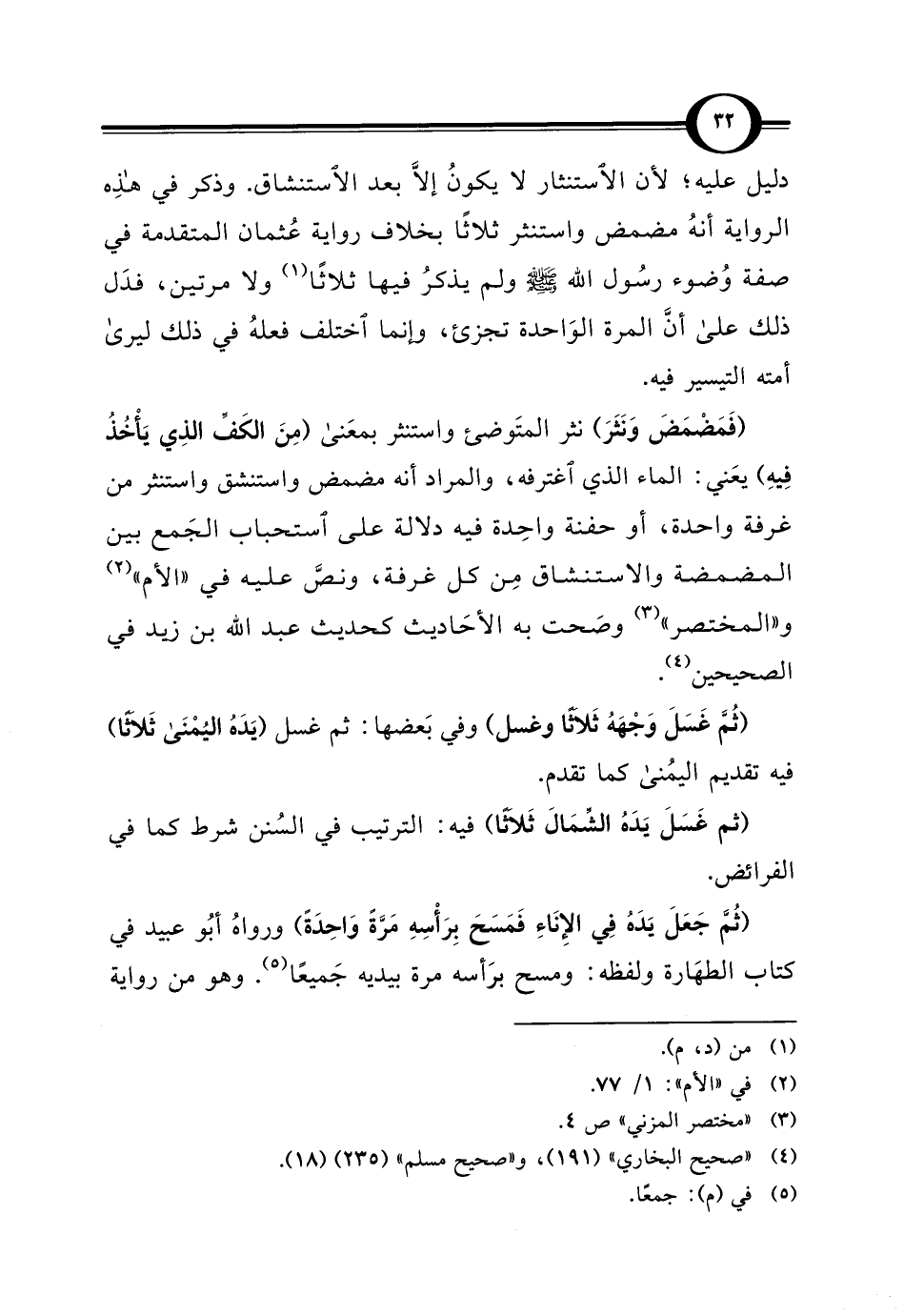 دليل عليه؛ لأن الاستنثار لا يكونُ إلَّا بعد الاستنشاق. وذكر في هذِه الرواية أنهُ مضمض واستنثر ثلاثًا بخلاف رواية عُثمان المتقدمة في صفة وُضوء رسُول الله - صلى الله عليه وسلم - ولم يذكرُ فيها ثلاثًا (¬1) ولا مرتين، فدَل ذلك على أنَّ المرة الوَاحدة تجزئ، وإنما اختلف فعلهُ في ذلك ليرى أمته التيسير فيه.