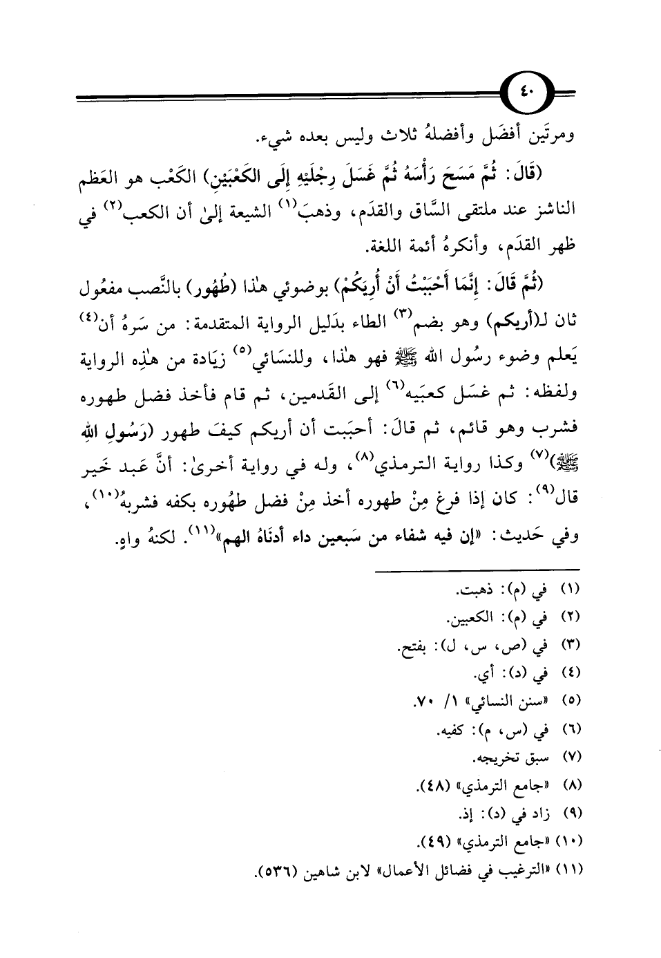 (قَالَ: ثُمَّ مَسَحَ رَأْسَهُ ثُمَّ غَسَلَ رِجْلَيهِ إِلَى الكَعْبَينِ) الكَعْب هو العَظم الناشز عند ملتقى السَّاق والقدَم، وذهبَ (¬1) الشيعة إلى أن الكعب (¬2) في ظهر القدَم، وأنكرهُ أئمة اللغة.