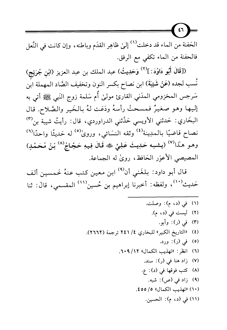 ([قَالَ أَبُو دَاوُدَ: ] (¬2) وَحَدِيثُ) عبد الملك بن عبد العزيز (ابْنِ جُرَيْجٍ) نُسب لجده (عَنْ شَيبَةَ) ابن نصاح بكسر النون وتخفيف الصَّاد المهملة ابن سَرجس المخزومي المدَني القارئ مولى أُم سَلمة زوج النَّبي -صلى الله عليه وسلم- أتي به إليها وهو صغيرٌ فمسحتْ رأسهُ ودَعَت لهُ بالخَير والصَّلاح. قال البخَاري: حَدثني الأويسي حَدَّثني الدراوردي، قال: رأيتُ شيبة بن (¬3) نصاح قاضيًا بالمدِينة (¬4) وثقه النسَائي، وروى (¬5) له حَديثًا واحدًا (¬6) وهو هذا (¬7) (يشبه حَدِيثَ عَلِيٍّ -رضي الله عنه- قَالَ فِيهِ حَجَّاجُ (¬8) بْنُ مُحَمَّدٍ) المصيصي الأعوَر الحَافظ، روى له الجماعة.