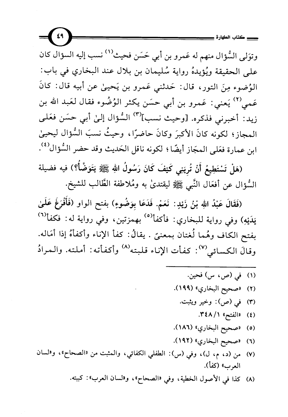وتوَلى السُّؤال منهم له عَمرو بن أبي حَسَن فحيث (¬1) نسب إليه السؤال كان على الحقيقة ويُؤيدهُ رواية سُليمان بن بلال عند البخاري في باب: الوُضوء مِنَ التور، قال: حَدثني عَمرو بن يَحيى عن أبيه قال: كانَ عَمي (¬2) يَعني: عَمرو بن أبي حسَن يكثر الوُضُوء فقال لعَبد الله بن زيد: أخبرني فذكره. [وحيث نسب] (¬3) السُّؤال إلى أبي حسَن فعَلى المجاز؛ لكونه كانَ الأكبرَ وكانَ حاضرًا، وحيثُ نسبَ السُّؤال ليحيى بن عمارة فعَلى المجَاز أيضًا؛ لكونه ناقل الحَديث وقد حضر السُّؤال (¬4).