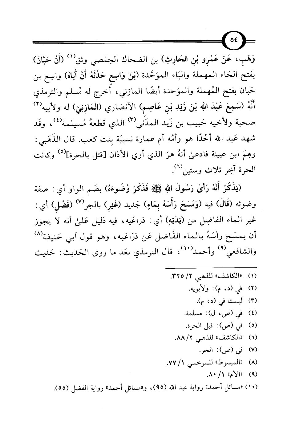وَهْبٍ، عَنْ عَمْرِو بْنِ الحَارِثِ) بن الضحاك الحِمْصي وثق (¬1) (أَنَّ حَبَّانَ) بفتح الحَاء المهملة والبَاء الموَحَّدة (بْنَ وَاسِع حَدَّثَهُ أَنَّ أَبَاهُ) واسِع بن حَبان بفتح المُهملة والموَحدة أيضًا المازني، أخرج له مُسلم والترمذي أَنَّهُ (سَمِعَ عَبْدَ الله بْنَ زَيْدِ بْنِ عَاصِمٍ) الأنصَاري (المَازِنيَّ) له ولأبيه (¬2) صحبة ولأخيه حَبيب بن زَيد المدَني (¬3) الذي قطعهُ مُسيلمة (¬4)، وقَد شهد عَبد الله أحُدًا هو وأمُه أم عمارة نسيبَة بِنت كعب. قال الذَهَبي: وهِمَ ابن عيينة فادعى أنهُ هوَ الذي أري الأذان أقتل بالحرة، (¬5) وكانت الحرة آخِر ثلاث وستين (¬6).