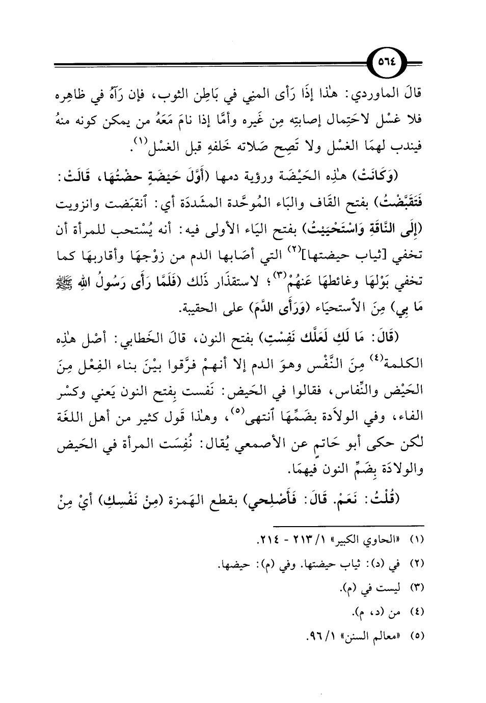 (قَالَ: مَا لَكِ لَعَلَّك نَفِسْتِ) بفتح النون، قالَ الخَطابي: أصْل هذِه الكلمة (¬4) مِنَ النَّفْس وهوَ الدم إلا أنهمْ فرَّقوا بيْنَ بناء الفِعْل مِنَ الحَيْض والنِّفاس، فقالوا في الحَيض: نَفست بِفتح النون يَعني وكسْر الفاء، وفي الولاَدة بضَمِّهَا انتهى (¬5)، وهذا قَول كثير من أهل اللغَة لكن حكى أبو حَاتمٍ عن الأصمعي يُقال: نُفِسَت المرأة في الحَيض والولادَة بِضَمِّ النون فيهمَا.