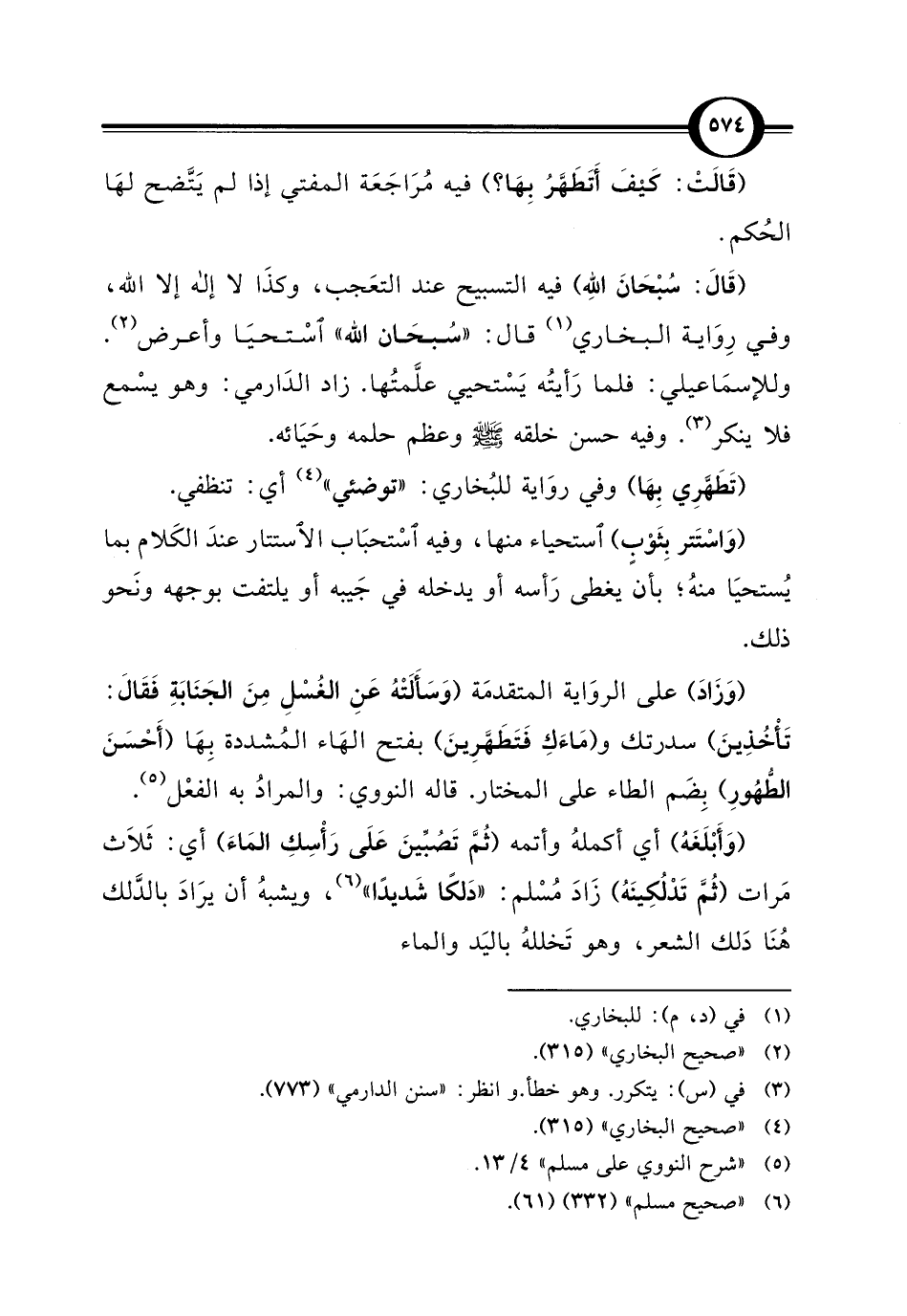 (قَالَتْ: كَيفَ أَتَطَهَّرُ بِهَا؟ ) فيه مُرَاجَعَة المفتي إذا لم يَتَّضح لهَا الحُكم.