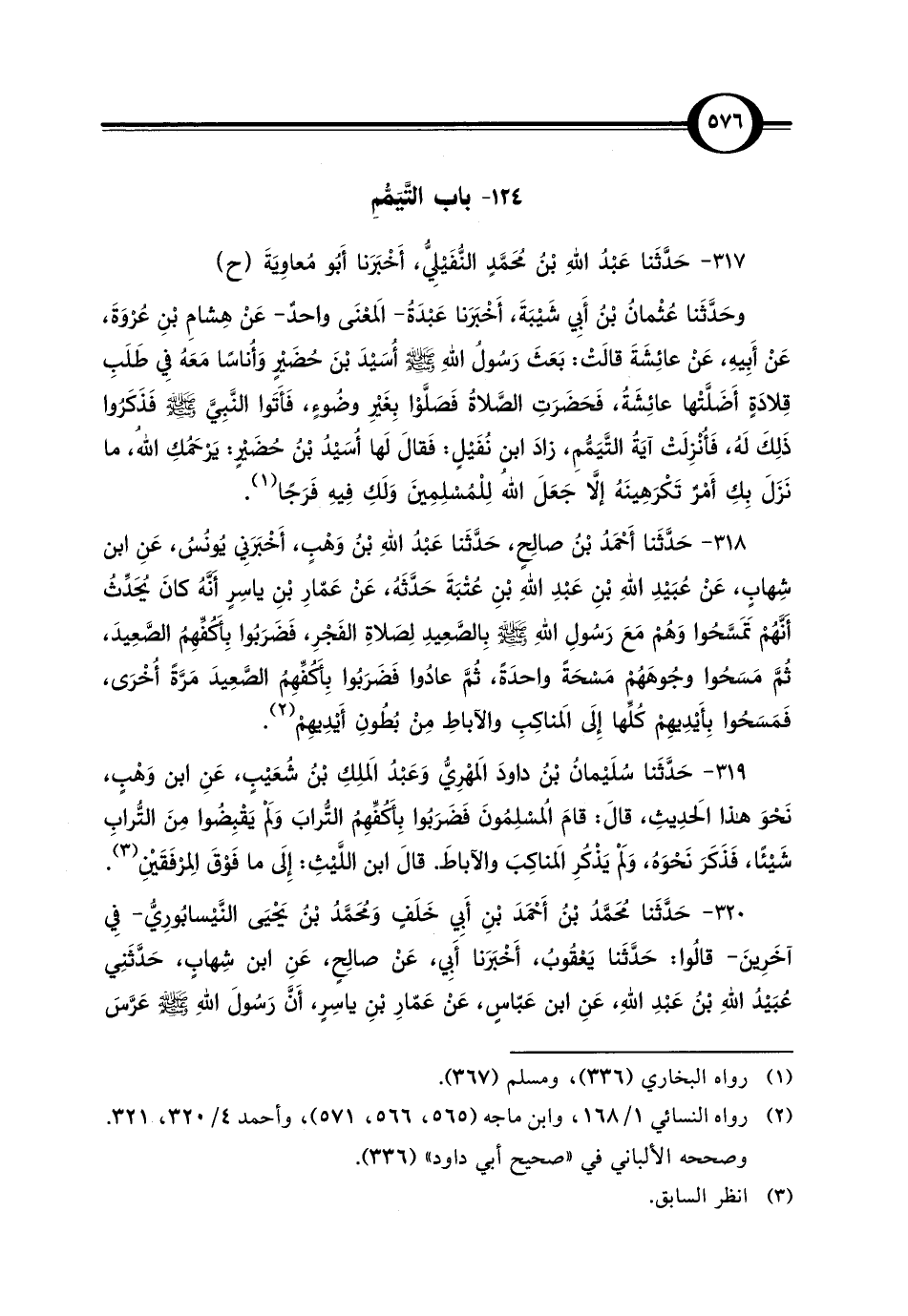 318 - حَدَّثَنا أَحْمَدُ بْن صالِحٍ، حَدَّثَنا عَبْدُ اللهِ بْنُ وَهْبٍ، أَخْبَرَنِي يُونُسُ، عَنِ ابن شِهابٍ، عَنْ عُبَيْدِ اللهِ بْنِ عَبْدِ اللهِ بْنِ عُتْبَةَ حَدَّثَة، عَنْ عَمّارِ بْنِ ياسِرٍ أَنَّهُ كانَ يُحَدِّث أنَهُمْ تَمَسَّحوا وَهُمْ مَعَ رَسُولِ اللهِ - صلى الله عليه وسلم - بِالصَّعِيدِ لِصَلاةِ الفَجْرِ، فَضَرَبُوا بِأَكُفِّهِمُ الصَّعِيدَ، ثُمَّ مَسَحُوا وجُوهَهُمْ مَسْحَةً واحدَةً، ثُمَّ عادُوا فَضَرَبُوا بِأَكُفِّهِمُ الصَّعِيدَ مَرَّةً أُخرَى، فَمَسَحُوا بِأَيْدِيِهِمْ كُلِّها إِلَى المَناكِبِ والآباطِ مِنْ بُطُونِ أَيْدِيِهِمْ (¬2).