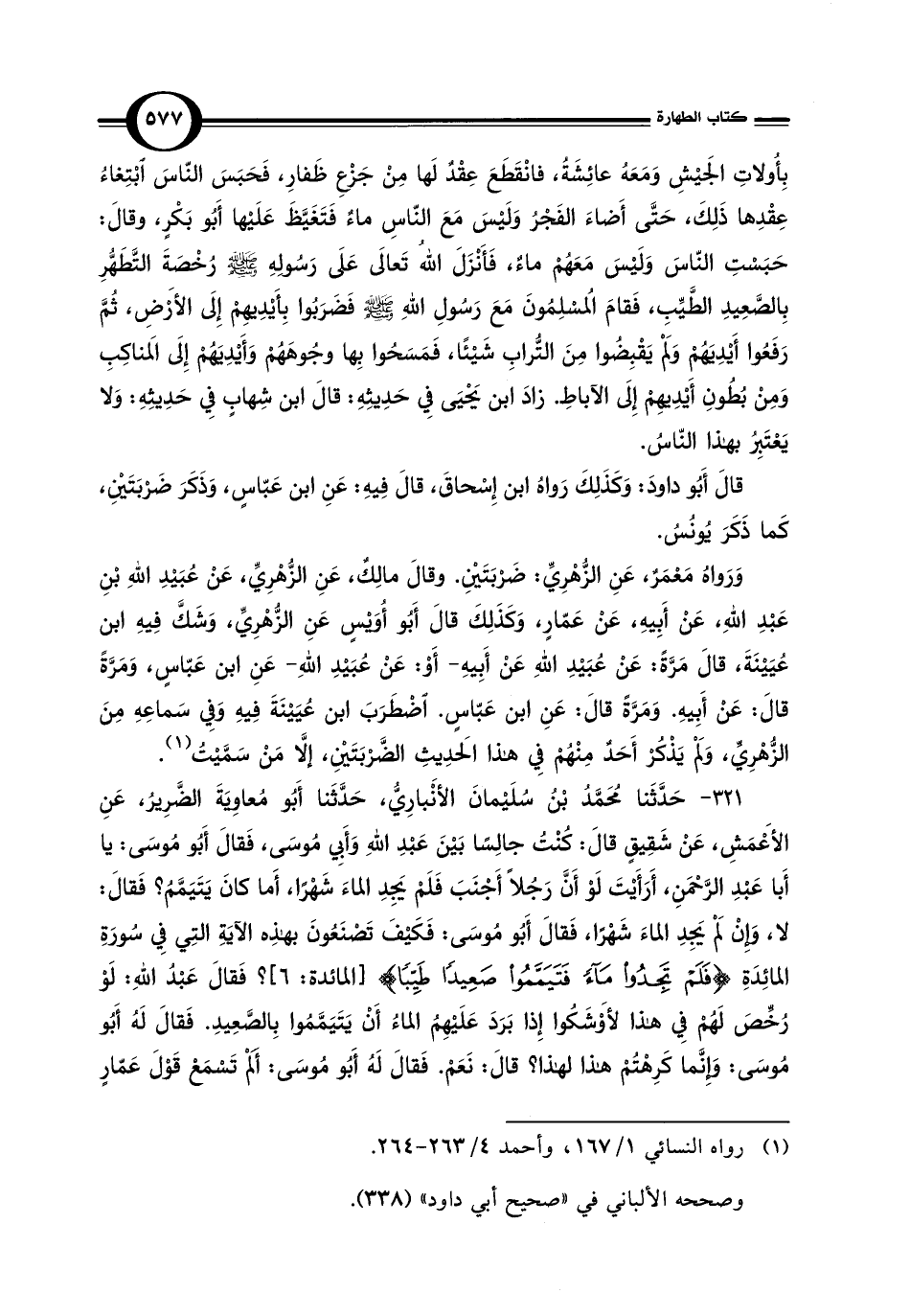 وَرَواهُ مَعْمَرٌ، عَنِ الزُّهْرِيِّ: ضَرْبَتَيْنِ. وقالَ مالِكٌ، عَنِ الزّهْرِيِّ، عَنْ عُبَيْدِ اللهِ بْنِ عَبْدِ اللهِ، عَنْ أَبِيهِ، عَنْ عَمّارٍ، وَكَذَلِكَ قالَ أبُو أُوَيْسٍ عَنِ الزُّهْرِيِّ، وَشَكَّ فِيهِ ابن عُيَيْنَةَ، قالَ مَرَّةً: عَنْ عُبَيْدِ اللهِ عَنْ أَبِيهِ -أَوْ: عَنْ عُبَيْدِ اللهِ- عَنِ ابن عَبّاسٍ، وَمَرَّةً قالَ: عَنْ أَبِيهِ. وَمَرَّةً قالَ: عَنِ ابن عَبّاسٍ. اضْطَرَبَ ابن عُيَيْنَةَ فِيهِ وَفِي سَماعِهِ مِنَ الزُّهْرِيِّ، وَلَمْ يَذْكرْ أَحَدٌ مِنْهُمْ فِي هذا الحَدِيثِ الضَّرْبَتَيْنِ، إلَّا مَنْ سَمَّيْت (¬1).