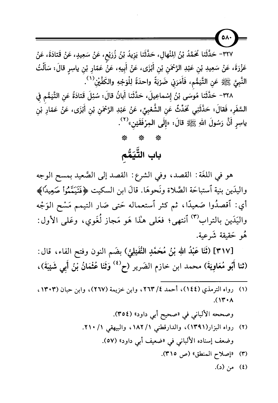 [317] (ثَنَا عَبْدُ الله بْنُ مُحَمَّدٍ النُّفَيلِيُّ) بضَم النون وفتح الفاء، قال: (ثنا أَبُو مُعَاوَيةَ) محمد ابن خازم الضَرير (ح (¬4) وَثَنَا عُثْمَانُ بْنُ أَبِي شَيْبَةَ)،