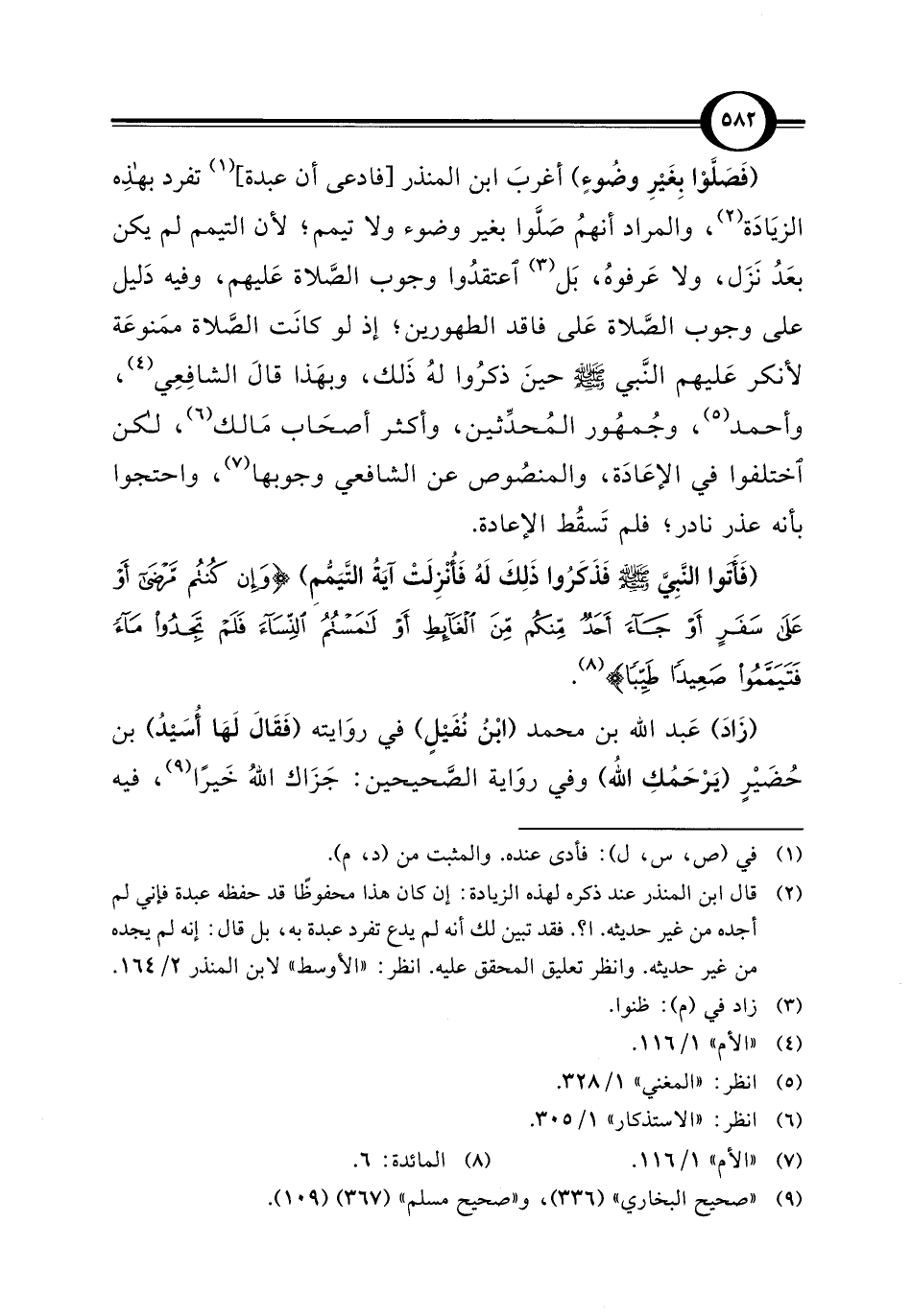 (¬2) قال ابن المنذر عند ذكره لهذه الزيادة: إن كان هذا محفوظًا قد حفظه عبدة فإني لم أجده من غير حديثه.! ؟ . فقد تبين لك أنه لم يدع تفرد عبدة به، بل قال: إنه لم يجده من غير حديثه. وانظر تعليق المحقق عليه. انظر: "الأوسط" لابن المنذر 2/ 164.