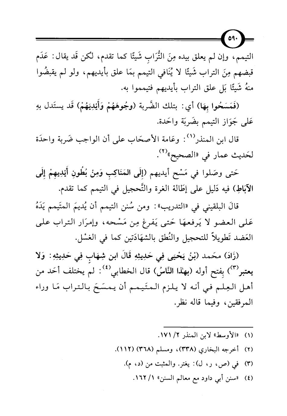 (زَادَ) محَمد (بْنُ يَحْيَى فِي حَدِيثِهِ قَال ابن شِهَاب فِي حَدِيثِهِ: وَلا يعتبر) (¬3) بِفتح أوله (بهذا النَّاسُ) قال الخطابي (¬4): لم يختلف أحَد من أهل العِلم في أنه لا يلزم المتَيمم أن يمسَحَ بالتراب مَا وراء المرفقين، وفيما قاله نظر.