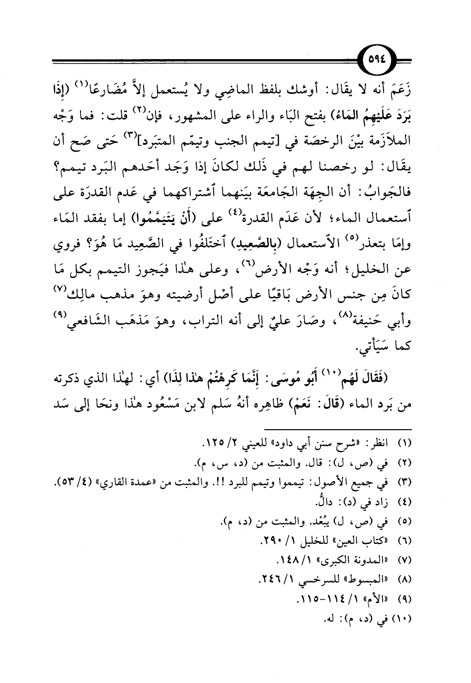 زَعَمَ أنه لا يقَال: أوشك بلفظ الماضِي ولا يُستعمل إلاَّ مُضَارعًا (¬1) (إِذَا بَرَدَ عَلَيهِمُ المَاءُ) بفتح البَاء والراء على المشهور، فإن (¬2) قلت: فما وَجْه الملاَزَمة بيْنَ الرخصَة في [تيمم الجنب وتيمّم المتبَرد] (¬3) حَتى صَح أن يقَال: لو رخصنا لهم في ذَلك لكانَ إذا وَجَد أحَدهم البَرد تيمم؟ فالجَوابُ: أن الجِهَة الجَامعَة بيَنهما اشتراكهما في عَدم القدرَة على استعمال الماء؛ لأن عَدَم القدرة (¬4) على (أَنْ يَتَيَمَّمُوا) إما بفقد المَاء وإمَا بتعذر (¬5) الاستعمال (بِالصَّعِيدِ) اختَلفُوا في الصَّعِيد مَا هُوَ؟ فروي عن الخليل؛ أنه وَجْه الأرض (¬6)، وعلى هذا فيَجوز التيمم بكل مَا كانَ مِن جنس الأرض بَاقيًا على أصْل أرضيته وهوَ مذهب مالِك (¬7) وأبي حَنيفة (¬8)، وصَارَ عليٌّ إلى أنه التراب، وهوَ مَذهَب الشَافعي (¬9) كما سَيَأتي.