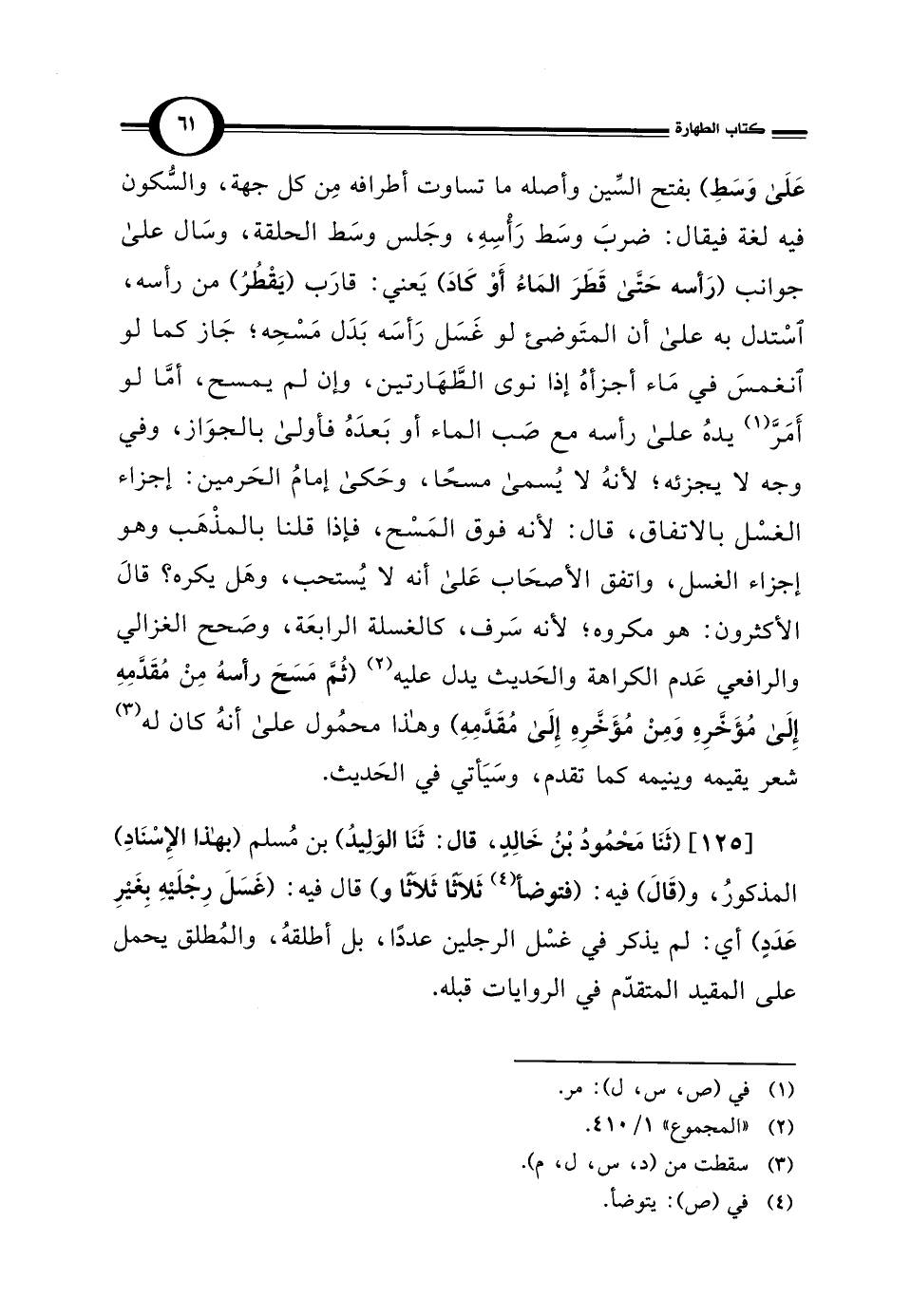 [125] (ثَنَا مَحْمُودُ بْنُ خَالِدٍ، قال: ثَنَا الوَلِيدُ) بن مُسلم (بهذا الإِسْنَادِ) المذكورُ، و (قَالَ) فيه: (فتوضأ (¬4) ثَلَاثًا ثَلَاثًا و) قال فيه: (غَسَلَ رِجْلَيهِ بِغَيرِ عَدَدٍ) أي: لم يذكر في غسْل الرجلين عددًا، بل أطلقهُ، والمُطلق يحمل على المقيد المتقدّم في الروايات قبله.