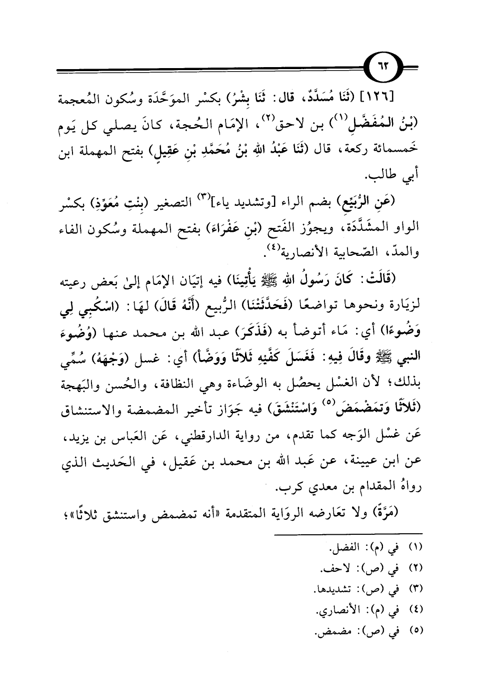 [126] (ثَنَا مُسَدَّدٌ، قال: ثَنَا بِشْرُ) بكسْر الموَحَّدَة وسُكون المُعجمة (بْنُ المُفَضَّلِ) (¬1) بن لاحق (¬2)، الإمَام الحُجة، كانَ يصلي كل يَوم خَمسمائة ركعة، قال (ثَنَا عَبْدُ الله بْنُ مُحَمَّدِ بْنِ عَقِيلٍ) بفتح المهملة ابن أبي طالب.