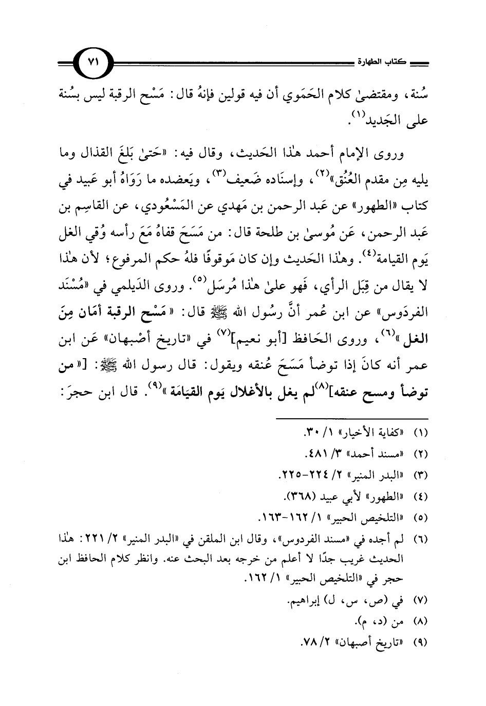 وروى الإمام أحمد هذا الحَديث، وقال فيه: "حَتى بَلغَ القذال وما يليه مِن مقدم العُنُق" (¬2)، وإسنَاده ضَعيف (¬3)، ويَعضده ما رَوَاهُ أبو عَبيد في كتاب "الطهور" عن عَبد الرحمن بن مَهدي عن المَسْعُودي، عن القاسِم بن عَبد الرحمن، عَن مُوسى بن طلحة قال: من مَسَحَ قفاهُ مَعَ رأسه وُقي الغل يَوم القيامة (¬4). وهذا الحَديث وإن كان مَوقوفًا فلهُ حكم المرفوع؛ لأن هذا لا يقال من قِبَل الرأي، فَهو على هذا مُرسَل (¬5). وروى الدَيلمي في "مُسْنَد الفردَوس" عن ابن عُمر أنَّ رسُول الله -صلى الله عليه وسلم- قال: "مَسْح الرقبة أمَان مِنَ الغل" (¬6)، وروى الحَافظ [أبو نعيم] (¬7) في "تاريخ أصْبهان" عَن ابن عمر أنه كانَ إذا توضأ مَسَحَ عُنقه ويقول: قال رسول الله -صلى الله عليه وسلم-: ["من توضأ ومسح عنقه] (¬8) لم يغل بالأغلال يَوم القيَامَة" (¬9). قال ابن حجرَ: