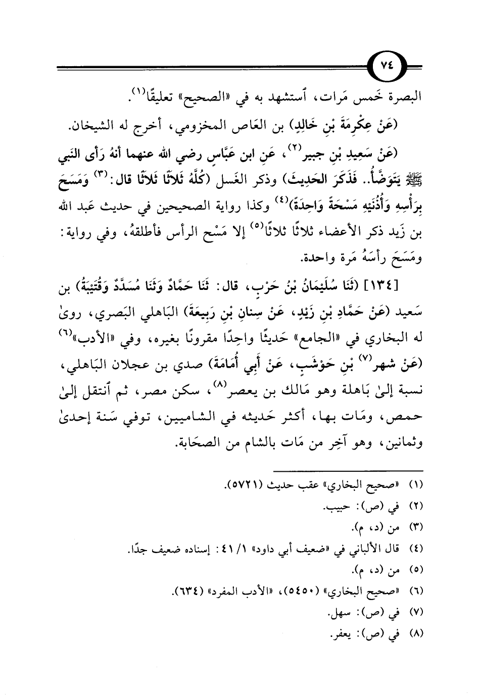 [134] (ثَنَا سُلَيمَانُ بْنُ حَرْبٍ، قال: ثَنَا حَمَّاذ وَثَنَا مُسَدَّدٌ وَقُتَيبَةُ) بن سَعيد (عَنْ حَمَّادِ بْنِ زَيْدٍ، عَنْ سِنانِ بْنِ رَبِيعَةَ) البَاهلي البَصري، روى له البخاري في "الجامع" حَديثًا واحِدًا مقرونًا بغيره، وفي "الأدب" (¬6) (عَنْ شهر (¬7) بْنِ حَوْشَبٍ، عَنْ أَبِي أُمَامَةَ) صدي بن عجلان البَاهلي، نسبة إلى بَاهلة وهو مَالك بن يعصر (¬8)، سكن مصر، ثم انتقل إلى حمص، ومَات بها، أكثر حَديثه في الشاميين، توفي سَنة إحدى وثمانين، وهو آخِر من مَات بالشام من الصحَابة.