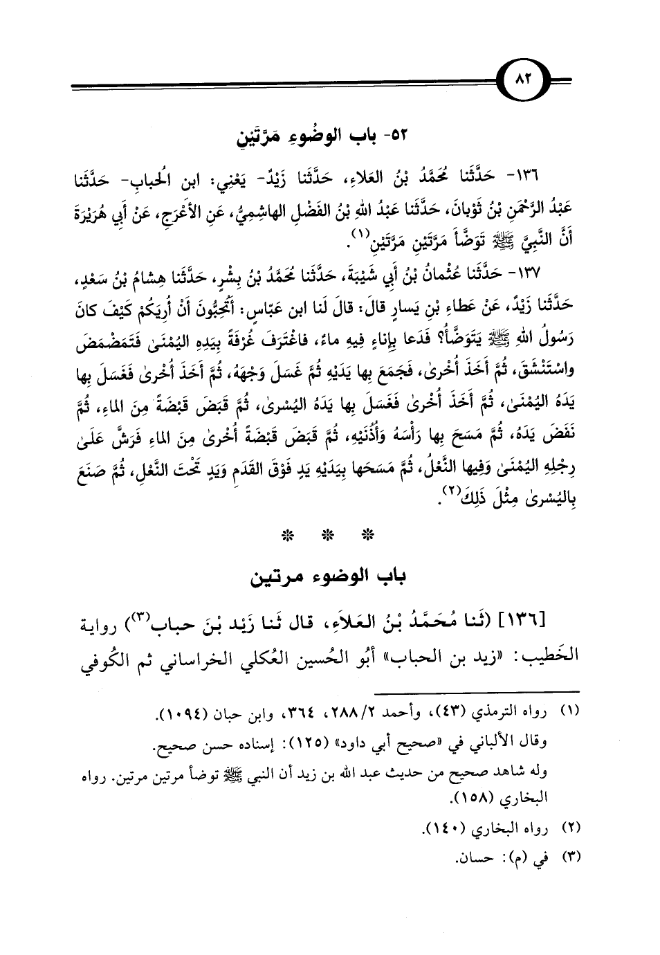 [136] (ثَنا مُحَمَّدُ بْنُ العَلاَءِ، قال ثَنا زَيْد بْنَ حباب) (¬3) رواية الخَطيب: "زيد بن الحباب" أبُو الحُسين العُكلي الخراساني ثم الكُوفي