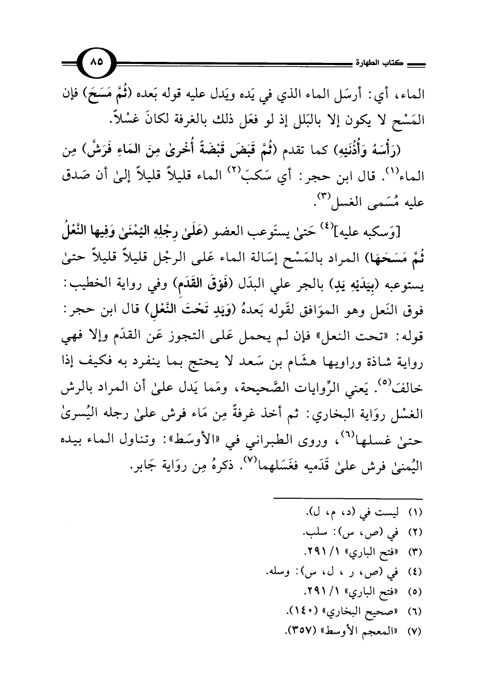 [وَسكبه عليه] (¬4) حَتى يستَوعب العضو (عَلَى رِجْلِهِ اليُمْنَى وَفِيها النَّعْلُ ثُمَّ مَسَحَهَا) المراد بالمَسْح إسَالة الماء عَلى الرجْل قليلًا قليلًا حتى يستوعبه (بِيَدَيْهِ يَدٍ) بالجر علي البدَل (فَوْقَ القَدَمِ) وفي رواية الخطيب: فوق النَعل وهو الموَافق لقَوله بَعدهُ (وَيَدٍ تَحْتَ النَّعْلِ) قال ابن حجر: قوله: "تحت النعل" فإن لم يحمل عَلى التجوز عَن القدَم وإلا فهي رواية شاذة وراويها هشَام بن سَعد لا يحتج بما ينفرد به فكيف إذا خالفَ (¬5). يَعني الرِّوايات الصَّحيحة، ومَما يَدل على أن المراد بالرش الغسْل روَاية البخاري: ثم أخذ غرفةً مِن مَاء فرش على رجله اليُسرى حتى غسلها (¬6)، وروى الطبراني في "الأوسَط": وتناول الماء بيده اليُمنى فرش على قَدَميه فغَسَلهما (¬7). ذكرهُ مِن روَاية جَابر.