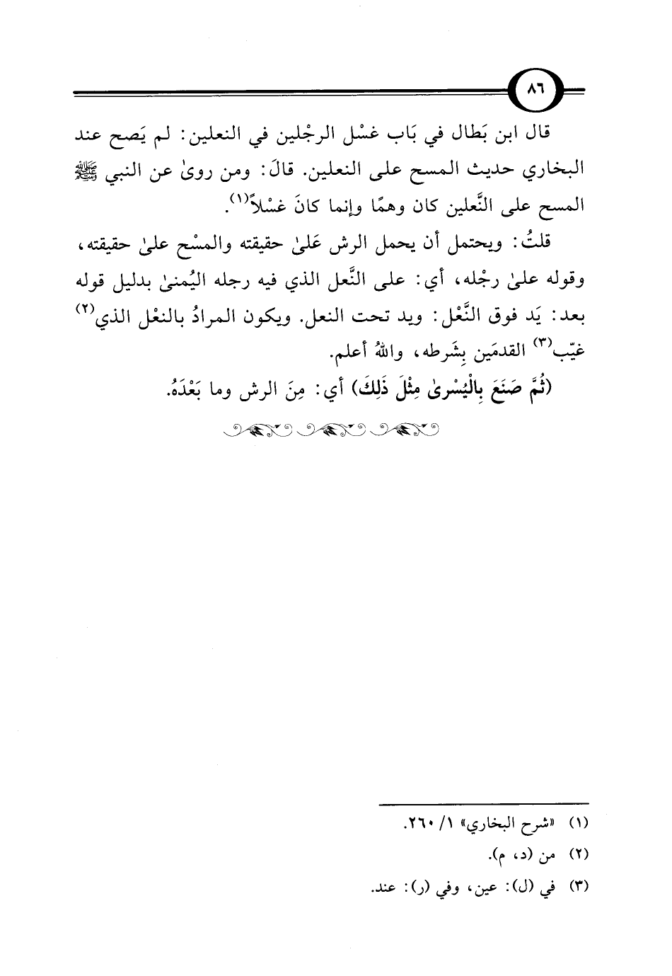 قال ابن بَطال في بَاب غسْل الرجْلين في النعلين: لم يَصح عند البخاري حديث المسح على النعلين. قالَ: ومن روى عن النبي - صلى الله عليه وسلم - المسح على النَّعلين كان وهمًا وإنما كانَ غسْلًا (¬1).
