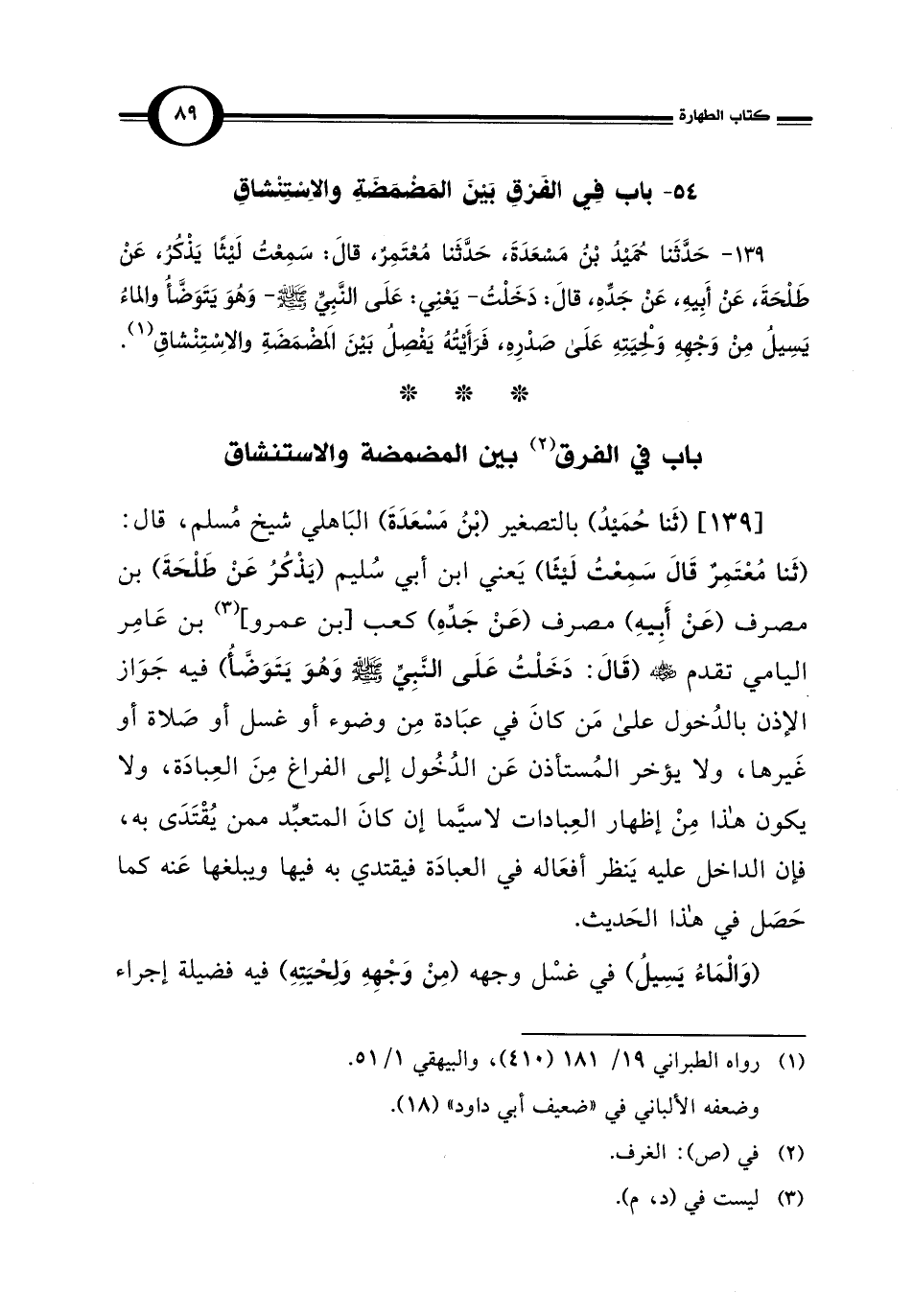 [139] (ثَنا حُمَيدُ) بالتصغير (بْنُ مَسْعَدَةَ) البَاهلي شيخ مُسلم، قال: (ثَنا مُعْتَمِرٌ قَالَ سَمِعْتُ لَيثًا) يَعني ابن أبي سُليم (يَذْكُرُ عَنْ طَلْحَةَ) بن مصرف (عَنْ أَبِيهِ) مصرف (عَنْ جَدِّهِ) كعب [بن عمرو] (¬3) بن عَامِر اليامي تقدم - رضي الله عنه - (قَالَ: دَخَلْتُ عَلَى النَّبِيِّ - صلى الله عليه وسلم - وَهُوَ يَتَوَضَّأُ) فيه جَوَاز الإذن بالدخول على مَن كانَ في عبَادة مِن وضوء أو غسل أو صَلاة أو غَيرها، ولا يؤخر المُستأذن عَن الدُخُول إلى الفراغ مِنَ العِبادَة، ولا يكون هذا مِنْ إظهار العِبادات لا سيَّما إن كانَ المتعبِّد ممن يُقْتَدَى به، فإن الداخل عليه يَنظر أفعَاله في العبادَة فيقتدي به فيها ويبلغها عَنه كما حَصَل في هذا الحَديث.
