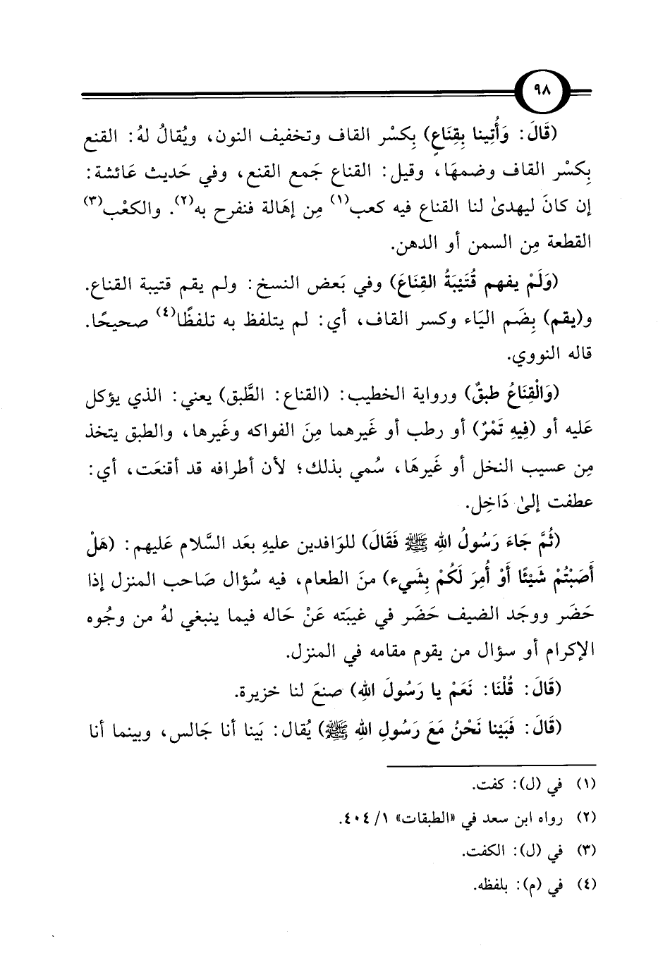 (قَالَ: وَأُتِينا بِقِنَاعٍ) بِكسْر القاف وتخفيف النون، ويُقالُ لهُ: القنع بِكسْر القاف وضمهَا، وقيل: القناع جَمع القنع، وفي حَديث عَائشة: إن كانَ ليهدى لنا القناع فيه كعب (¬1) مِن إهَالة فنفرح به (¬2). والكعْب (¬3) القطعة مِن السمن أو الدهن.