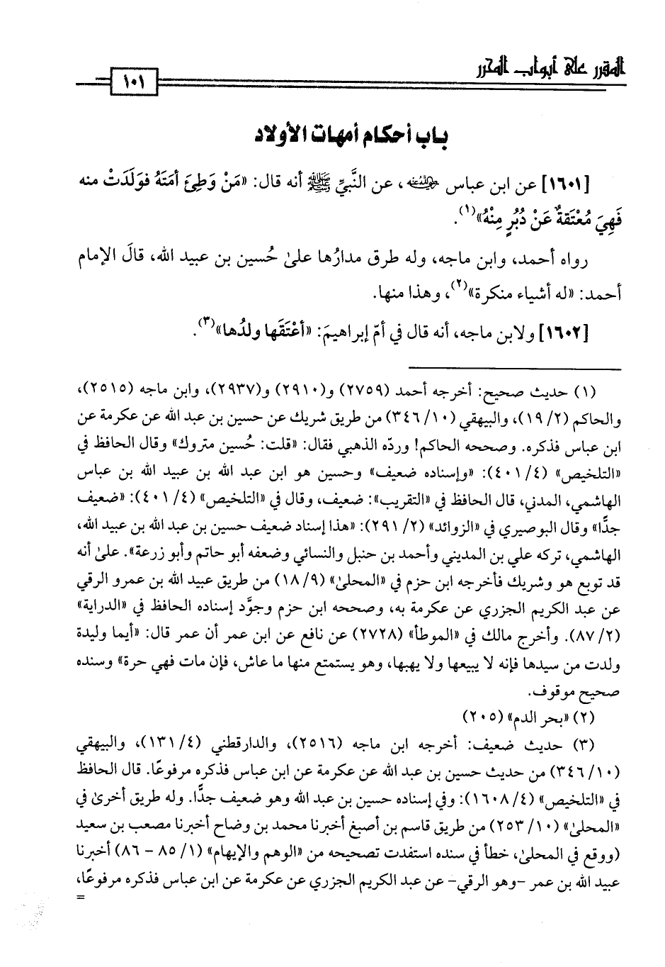 [1601] عن ابن عباس -رضي اللَّه عنهما-، عن النَّبِيّ -صلى اللَّه عليه وسلم- أنه قال: "مَنْ وَطِئَ أمَتَهُ فوَلَدَتْ منه فَهِيَ مُعْتَقةٌ عَنْ دُبُرٍ مِنْهُ" (¬1).