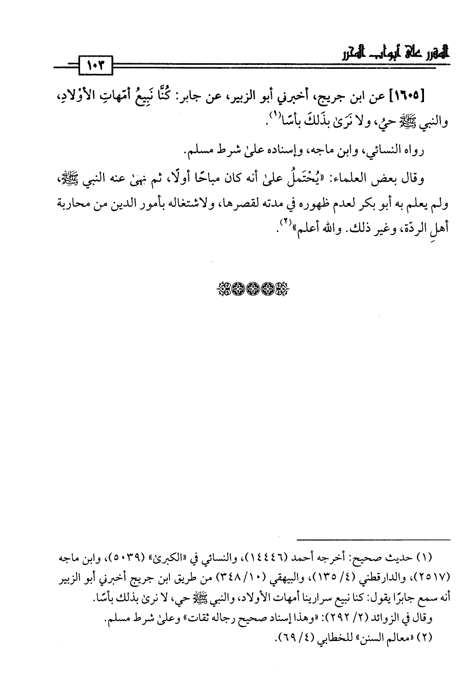 [1605] عن ابن جريح، أخبرني أبو الزبير، عن جابر: كُنَّا نَبِيعُ أمّهاتِ الأوْلادِ، والنبي -صلى اللَّه عليه وسلم- حيُ، ولا نرى بذَلكَ بأسًا (¬1).