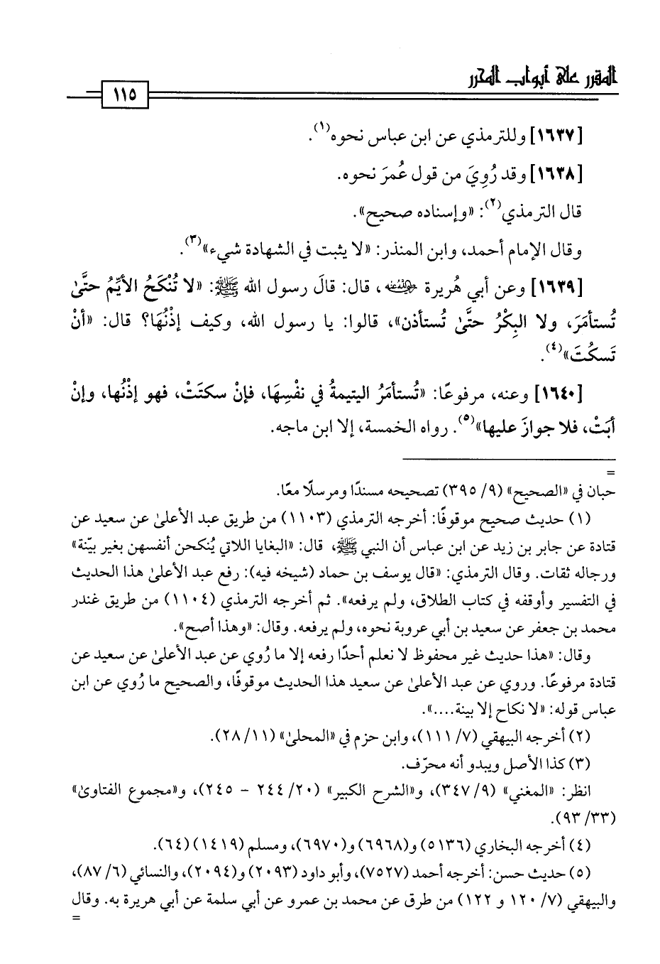 [1640] وعنه، مرفوعًا: "تُستأمَرُ اليتيمةُ في نفْسِهَا، فإنْ سكتَتْ، فهو إذْنُها، وإنْ أبَتْ، فلا جوازَ عليها" (¬5). رواه الخمسة، إلا ابن ماجه.