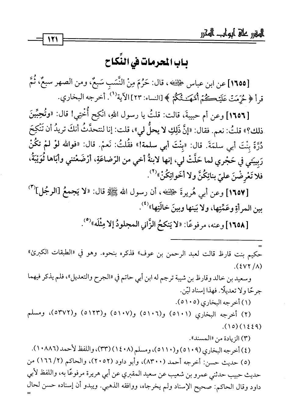 [1655] عن ابن عباس -رضي اللَّه عنهما-، قال: حَرُمَ مِنْ النَّسَب سَبعٌ، ومن الصهر سبعٌ، ثُمَّ قرأ {حُرِّمَتْ عَلَيْكُمْ أُمَّهَاتُكُمْ} [النساء: 23] الآية (¬1). أخرجه البخاري.