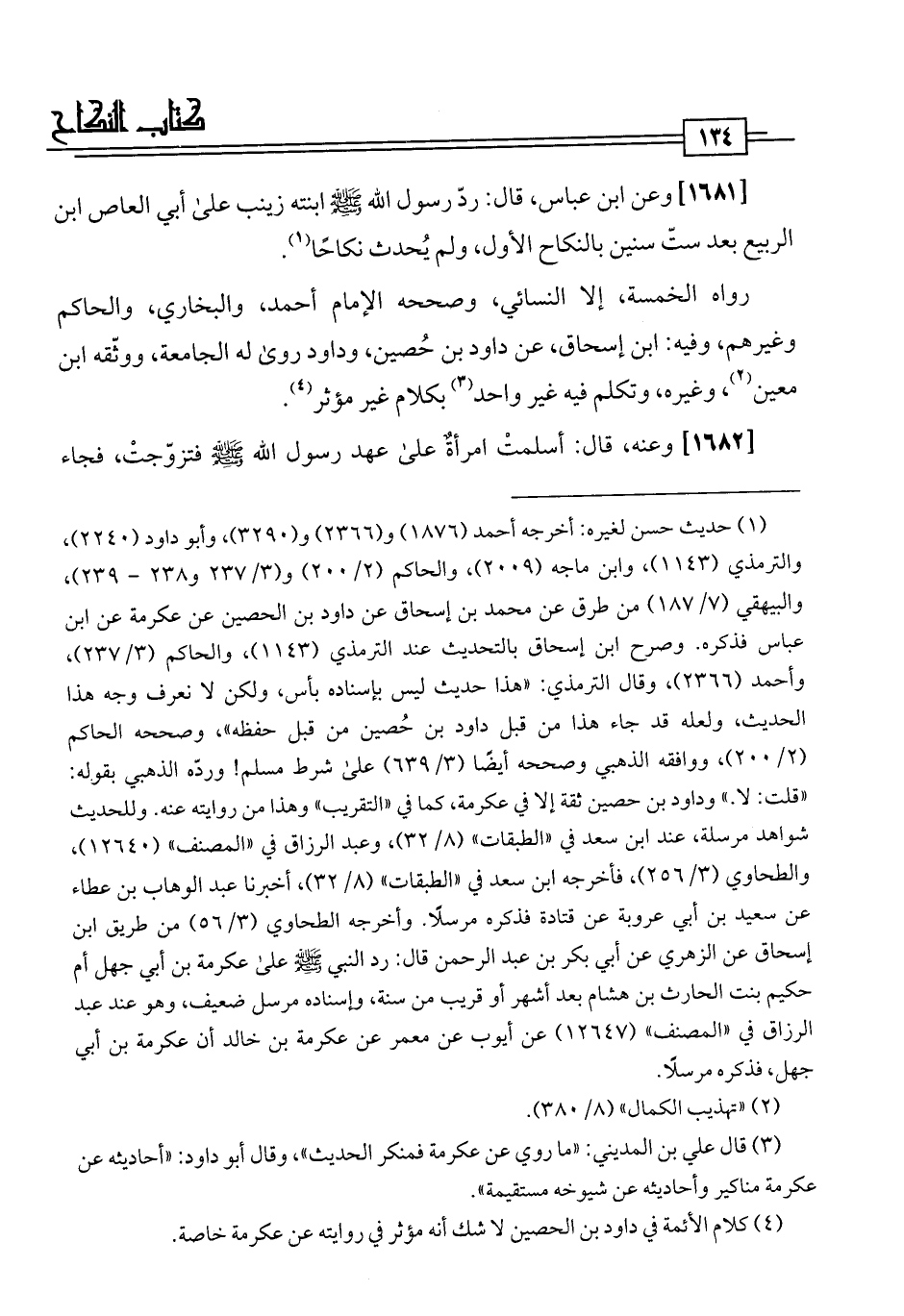 [1681] وعن ابن عباس، قال: ردّ رسول اللَّه -صلى اللَّه عليه وسلم- ابنته زينب على أبي العاص ابن الربيع بعد ستّ سنين بالنكاح الأول، ولم يُحدث نكاحًا (¬1).