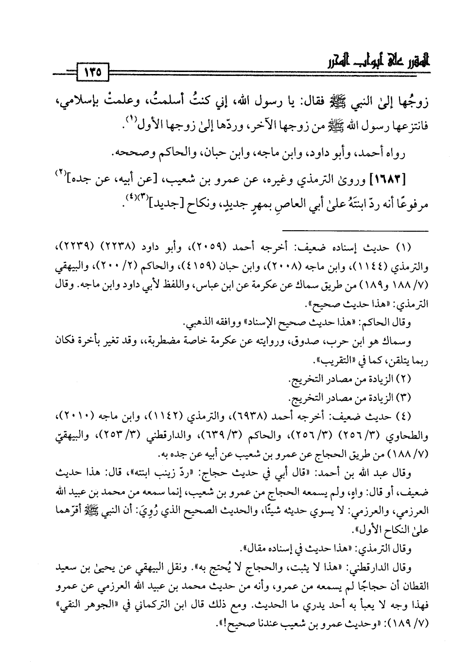 [1683] وروى الترمذي وغيره، عن عمرو بن شعيب، [عن أبيه، عن جده] (¬2) مرفوعًا أنه ردّ ابنتَهُ على أبي العاصِ بمهرٍ جديدٍ، ونكاح [جديد] (¬3) (¬4).