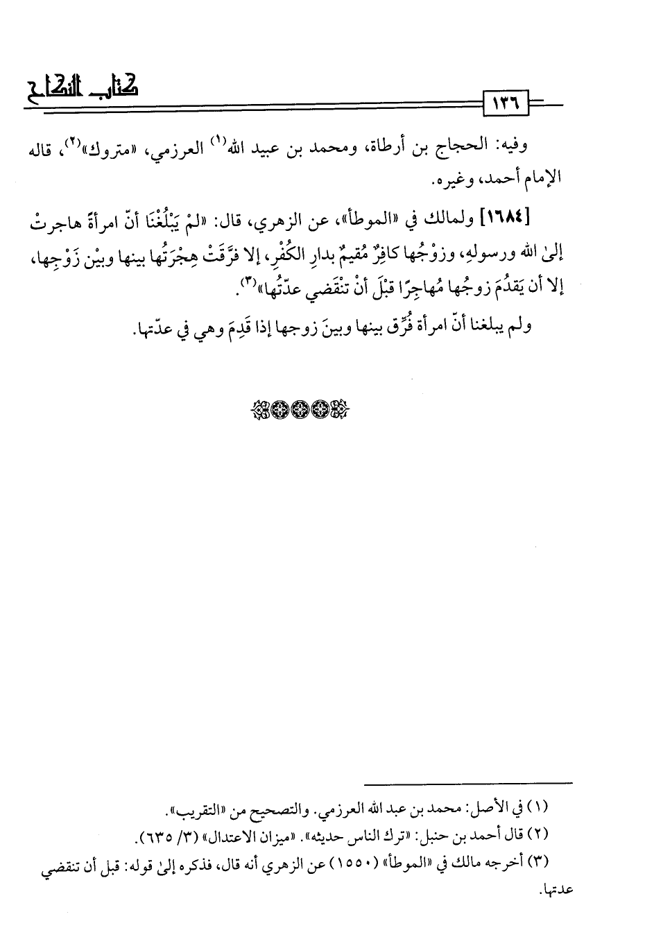 [1684] ولمالك في "الموطأ"، عن الزهري، قال: "لمْ يَبْلُغْنَا أنّ امرأةً هاجرتْ إلى اللَّه ورسولهِ، وزوْجُها كافِرٌ مُقيمٌ بدارِ الكُفْرِ، إلا فرَّقَتْ هِجْرَتُها بينها وبيْن زَوْجِها، إلا أن يَقدُمَ زوجُها مُهاجِرًا قبْلَ أنْ تنْقَضي عدّتُها" (¬3).