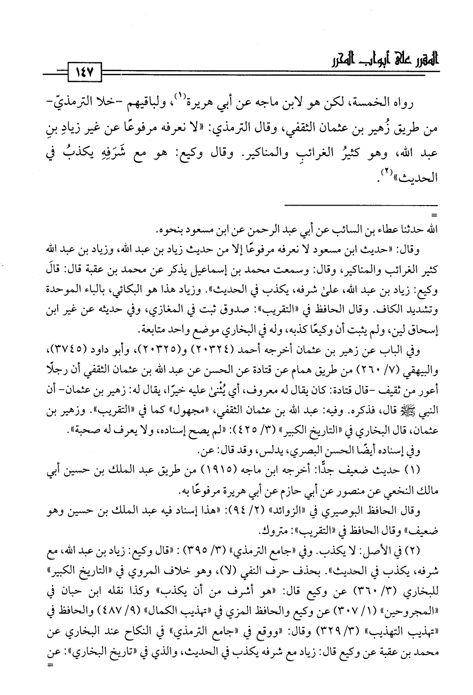 وقال: "حديث ابن مسعود لا نعرفه مرفوعًا إلا من حديث زياد بن عبد اللَّه، وزياد بن عبد اللَّه كثير الغرائب والمناكير، وقال: وسمعت محمد بن إسماعيل يذكر عن محمد بن عقبة قال: قَالَ وكيع: زياد بن عبد اللَّه، على شرفه، يكذب في الحديث". وزياد هذا هو البكائي، بالباء الموحدة وتشديد الكاف. وقال الحافظ في "التقريب": صدوق ثبت في المغازي، وفي حديثه عن غير ابن إسحاق لين، ولم يثبت أن وكيعًا كذبه، وله في البخاري موضع واحد متابعة.
