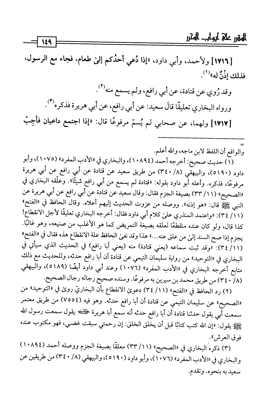 (¬1) حديث صحيح: أخرجه أحمد (10894)، والبخاري في "الأدب المفرد" (1075)، وأبو داود (5190)، والبيهقي (8/ 340) من طريق سعيد عن قتادة عن أبي رافع عن أبي هريرة مرفوعًا، فذكره. وأعله أبو داود بقوله: "قتادة لم يسمع من أبي رافع شيئًا". وعلّقه البخاري في "الصحيح" (11/ 33) بصيغة الجزم فقال: وقال سعيد عن قتادة عن أبي رافع عن أبي هريرة عن النبي -صلى اللَّه عليه وسلم- قال: "هو إذنه". ووصله من عزوت الحديث إليهم أعلاه. وقال الحافظ في "الفتح" (11/ 34): "واعتمد المنذري على كلام أبي داود فقال: أخرجه البخاري تعليقًا لأجل الانقطاع! كذا قال، ولو كان عنده منقطعًا لعلقه بصيغة التمريض كما هو الأغلب من صنيعه، وهو غالبًا. يجزم إذا صح السند إلى من علق عنه. . . " هذا وقد نفى الحافظ علة الانقطاع هذه فقال في "الفتح" (11/ 34): "وقد ثبت سماعه (يعني قتادة) منه (يعني أبا رافع) في الحديث الذي سيأتي في البخاري في "التوحيد" من رواية سليمان التيمي عن قتادة أن أبا رافع حدثه، وللحديث مع ذلك متابع أخرجه البخاري في "الأدب المفرد" (1076) وعند أبي داود أيضًا (5189)، والبيهقي (8/ 340) من طريق محمد بن سيرين به مرفوعًا. وسنده صحيح رجاله رجال الصحيح.