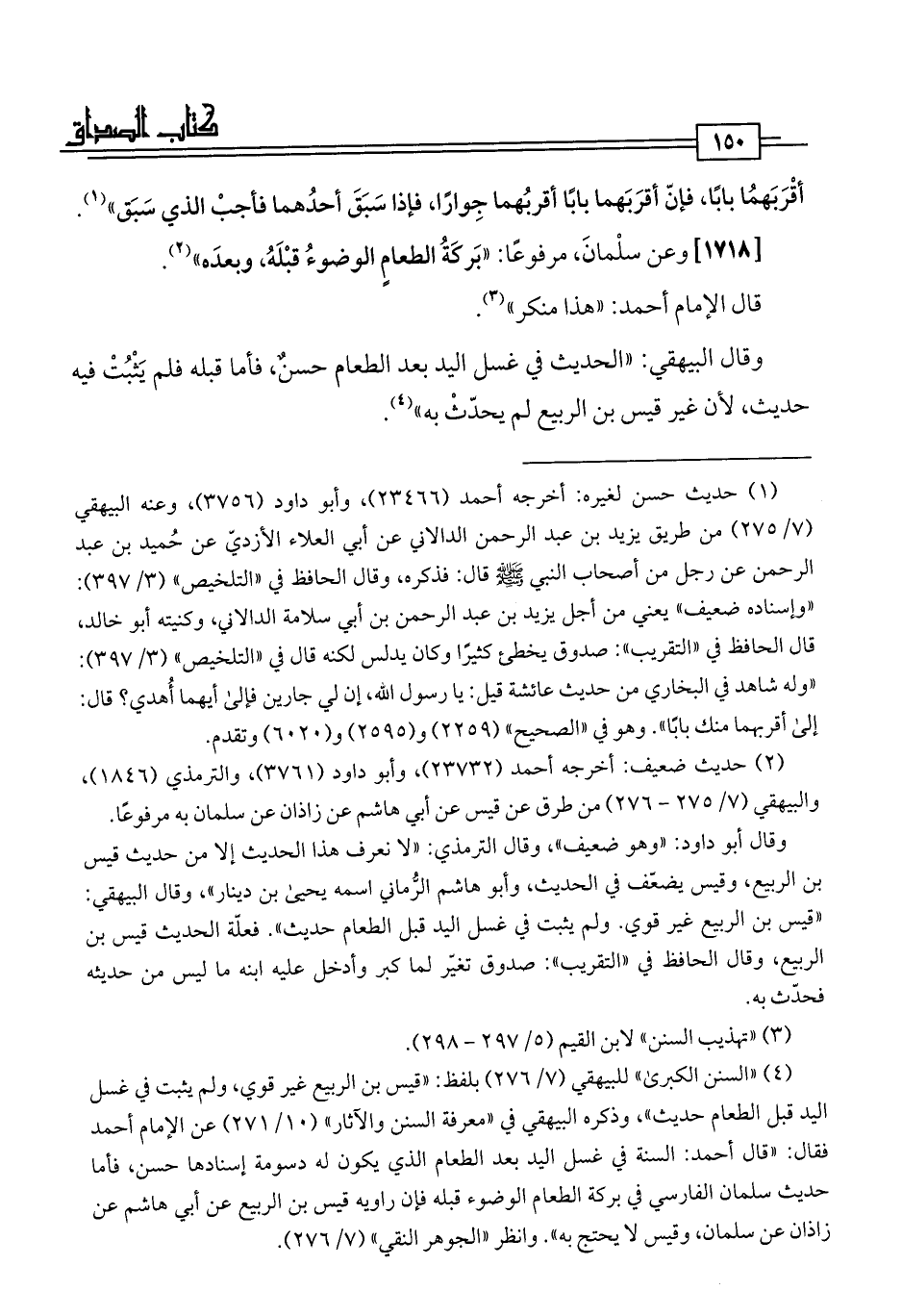 [1718] وعن سلْمانَ، مرفوعًا: "بَركَةُ الطعامٍ الوضوءُ قبْلَهُ، وبعدَه" (¬2).