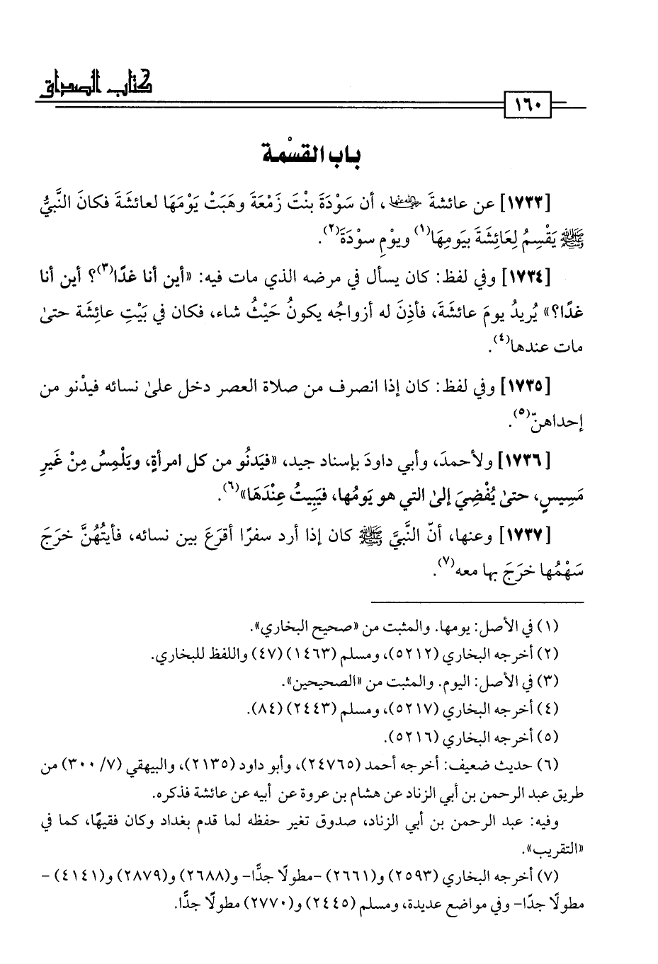 [1733] عن عائشةَ -رضي اللَّه عنها-، أن سَوْدَةَ بنْتَ زَمْعَةَ وهَبَتْ يَوْمَهَا لعائشَةَ فكانَ النَّبيُّ -صلى اللَّه عليه وسلم- يَقْسِمُ لِعَائِشَةَ بيَومِهَا (¬1) ويوْمِ سوْدَةَ (¬2).