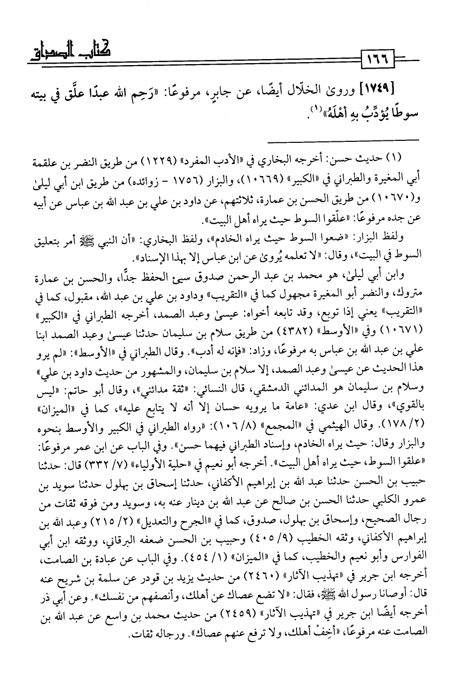 [1749] وروى الخلّال أيضًا، عن جابرٍ، مرفوعًا: "رَحِم اللَّه عبدًا علَّق في بيته سوطًا يُؤدِّبُ بهِ أهْلَهُ" (¬1).