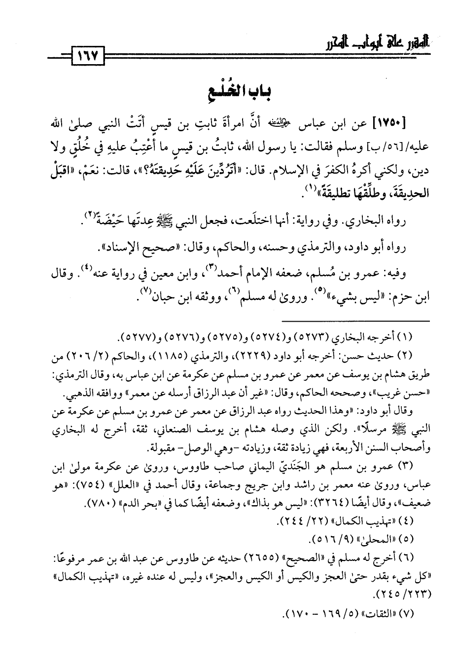 [1750] عن ابن عباس -رضي اللَّه عنهما- أنَّ امرأةَ ثابتِ بن قيسٍ أتَتْ النبي صلى اللَّه عليه وسلم فقالت: يا رسول اللَّه، ثابتُ بن قيسٍ ما أعْتِبُ عليهِ في خُلُقٍ ولا دين، ولكني أكرهُ الكفرَ في الإسلام. قال: "أتَرُدِّينَ عَلَيْهِ حَدِيقتَهُ؟ "، قالت: نعَمْ، "اقبَلْ الحدِيقَةَ، وطلِّقْهَا تطليقَةً" (¬1).