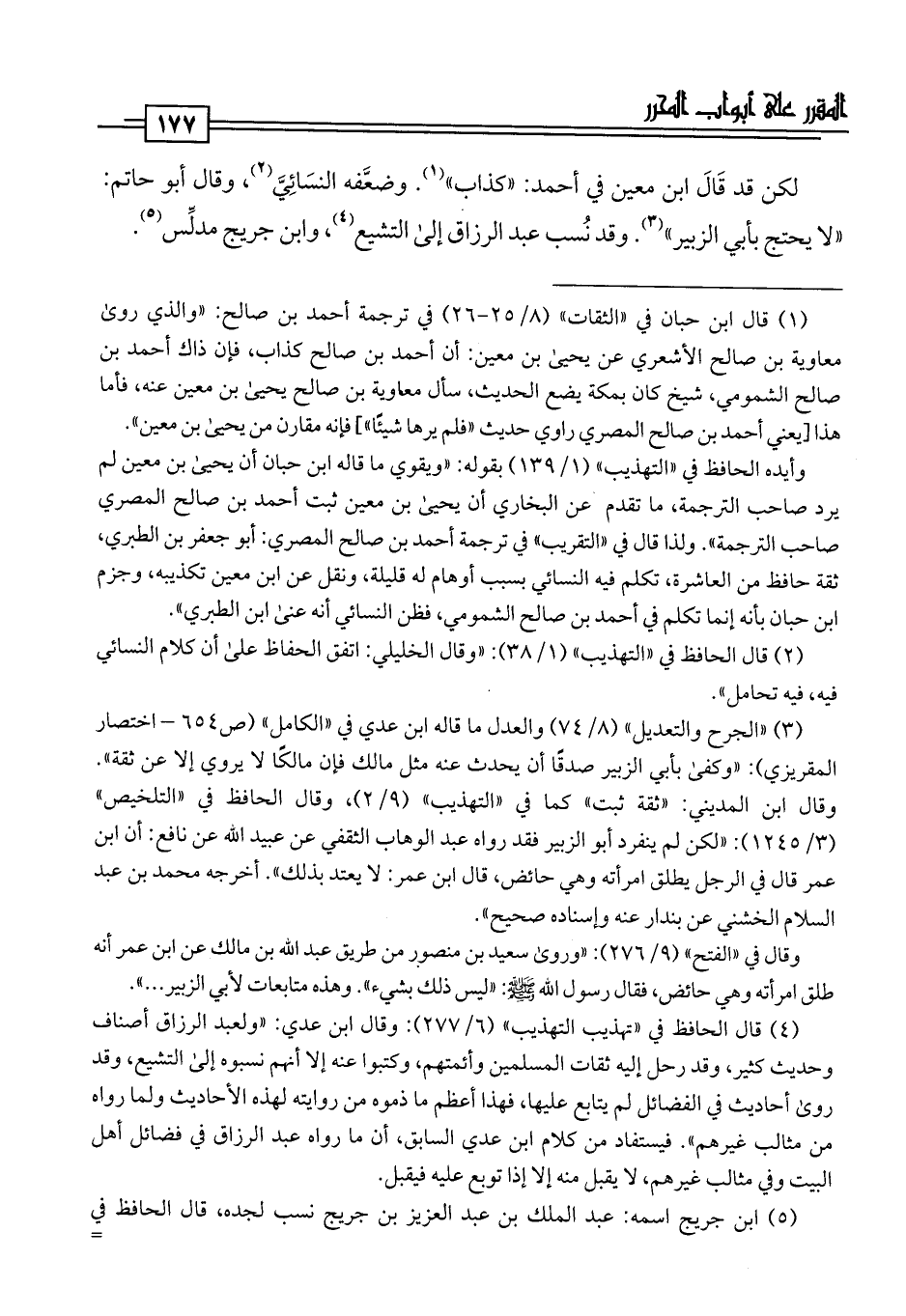 لكن قد قَالَ ابن معين في أحمد: "كذاب" (¬1). وضعَّفه النسَائِيَّ (¬2)، وقال أبو حاتم: "لا يحتج بأبي الزبير" (¬3). وقد نُسب عبد الرزاق إلى التشيع (¬4)، وابن جريج مدلِّس (¬5).