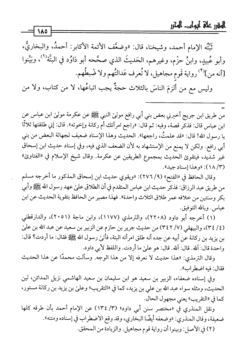 ثَبَّتُه الإمام أحمد، وشيخنا، قال: "وضعَّف الأئمة الأكابر: أحمدُ، والبخاريُّ، وأبو عُبيدٍ، وابنُ حزْم، وغيرهم، الحَديثَ الذي صحَّحه أبو دَاوُد في البتَّة (¬1)، وبَيَّنوا [أنه من] (¬2) رواية قَومٍ مجاهيل، لا تُعرف عَدالتُهم ولا ضْبطُهم.