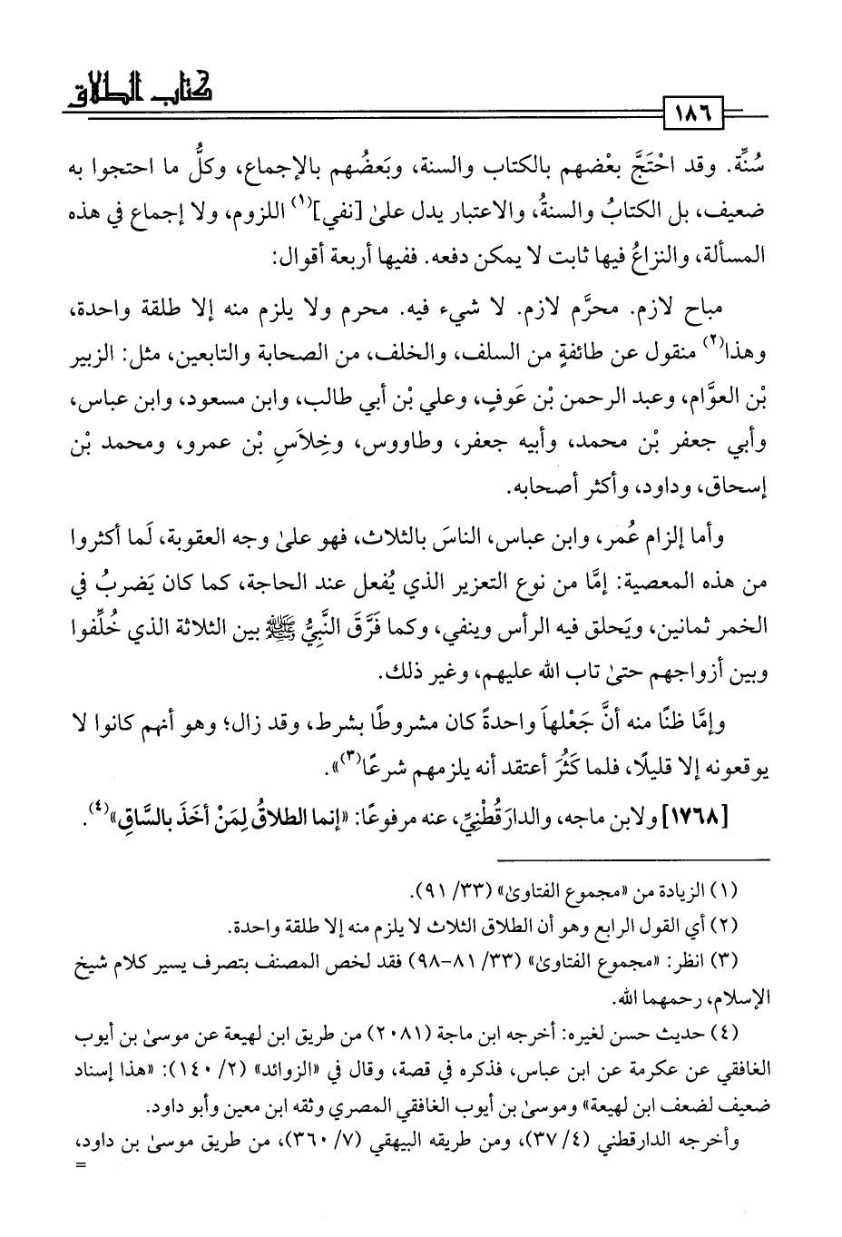 وأما إلزام عُمر، وابن عباس، الناسَ بالثلاث، فهو على وجه العقوبة، لَما أكثروا من هذه المعصية: إمَّا من نوع التعزير الذي يُفعل عند الحاجة، كما كان يَضربُ في الخمر ثمانين، ويَحلق فيه الرأس وينفي، وكما فَرَّقَ النَّبِيُّ -صلى اللَّه عليه وسلم- بين الثلاثة الذي خُلِّفوا وبين أزواجهم حتى تاب اللَّه عليهم، وغير ذلك.