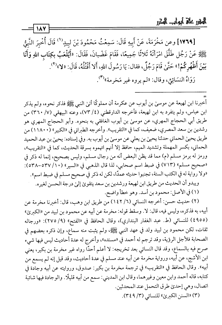[1769] وعن مَخْرَمَةَ، عَنْ أَبِيهِ قَالَ: سَمِعْتُ مَحْمُودَ بْنَ لبِيدٍ (¬1) قَالَ أُخْبِرَ النَّبِيُّ -صلى اللَّه عليه وسلم- عَنْ رَجُل طَلَّقَ امْرَأتَهُ ثَلاثًا جَمِيعًا، فَقَامَ غَضْبانَ، فَقَالَ: "أَيُلْعَبُ بكِتَاب اللَّهِ وَأَنَا بَيْنَ أَظْهُرِكُمْ! " حَتَّى قَامَ رَجُلٌ، فقال: يَا رَسُولَ اللَّهِ، أَلا أَقْتُلُهُ، قَالَ: "لا" (¬2).