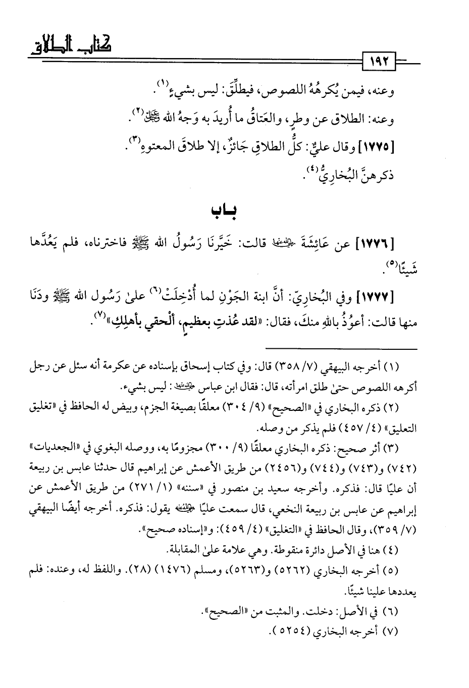 [1776] عن عَائِشَةَ -رضي اللَّه عنها- قالت: خَيَّرنَا رَسُولُ اللَّه -صلى اللَّه عليه وسلم- فاخترناه، فلم يَعُدَّها شَيئًا (¬5).