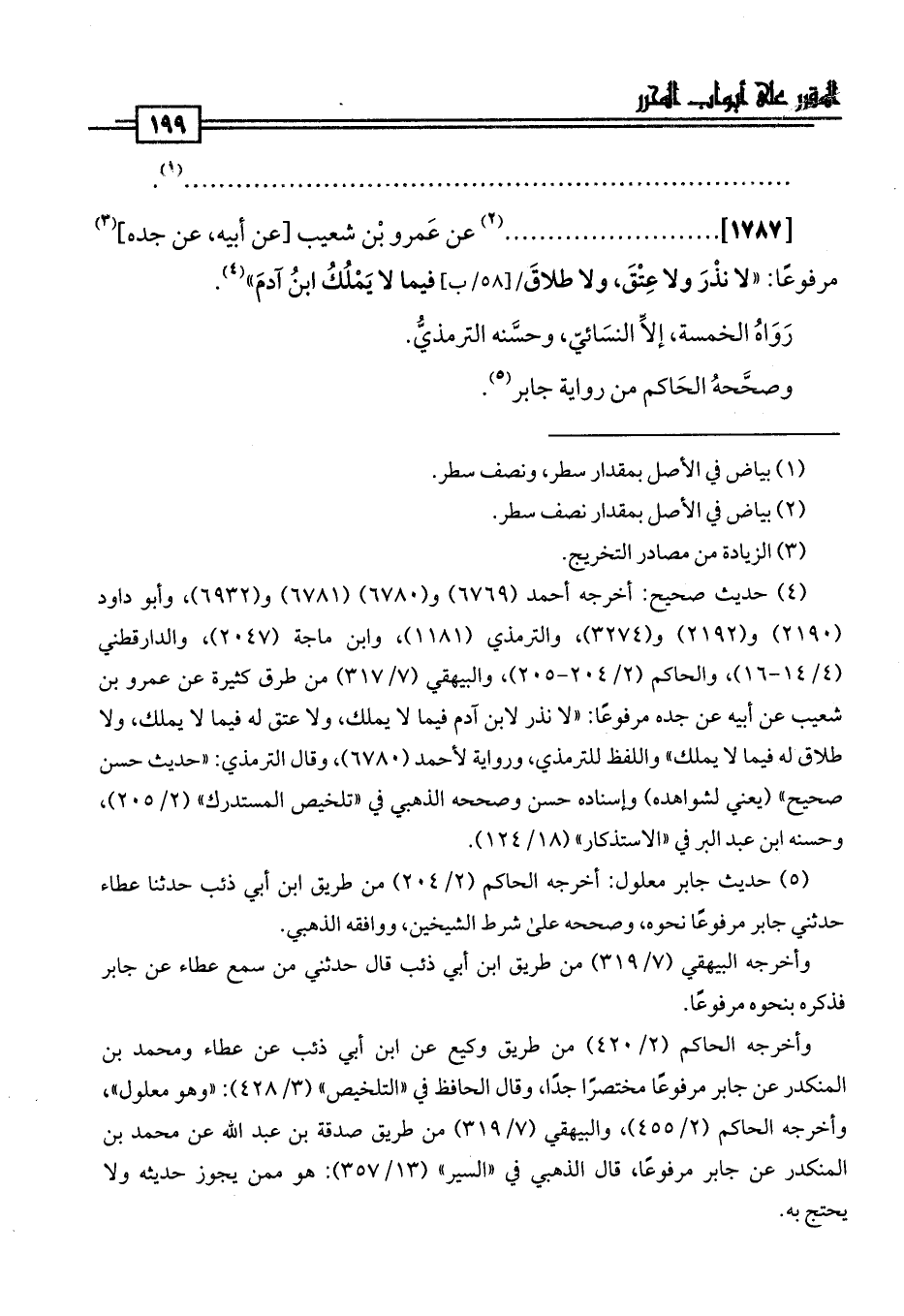 [1787]. . . . . . . . . . (¬2) عن عَمرو بن شعيب [عن أبيه، عن جده] (¬3) مرفوعًا: "لا نذْرَ ولا عِتْقَ، ولا طلاقَ فيما لا يَمْلُكُ ابنُ آدمَ" (¬4).