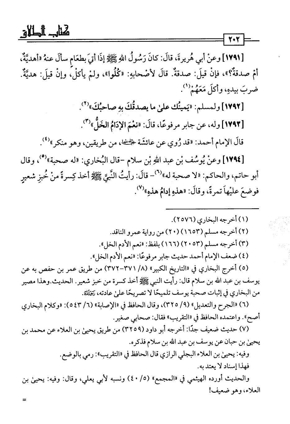 [1794] وعنْ يُوسُف بن عبد اللَّهِ بن سلام -قال البُخاري: "له صحبة" (¬5)، وقال أبو حاتم، والحاكم: "لا صحبة له" (¬6) - قَالَ: رأيتُ النَّبيَّ -صلى اللَّه عليه وسلم- أخذ كِسرةً منْ خُبزِ شعيرٍ فوضعَ عليْهاَ تمرةً، وقالَ: "هذهِ إدامُ هذهِ" (¬7).
