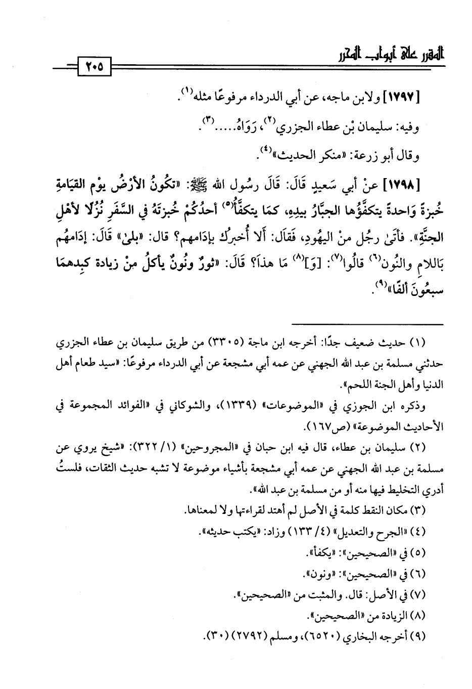 [1798] عنْ أبي سَعيدٍ قَالَ: قَالَ رسُول اللَّه -صلى اللَّه عليه وسلم-: "تكُونُ الأرْضُ يوْم القيَامةِ خُبزةً وَاحدةً يتكفَّؤُها الجبَّارُ بيدِهِ، كمَا يتكفَّأُ (¬5) أحدُكُمْ خُبزتَهُ في السَّفَرِ نُزُلًا لأهْلِ الجنَّةِ". فأتَى رجُل منْ اليهُودِ، فَقاَل: أَلا أُخبرُك بإدَامهم؟ قال: "بلى" قَالَ: إدَامهُم بَاللامِ والنُون (¬6) قالُوا (¬7): [وَ] (¬8) مَا هذاَ؟ قَالَ: "ثورٌ ونُونٌ يأكلُ منْ زيادة كبِدهمَا سبعُونَ ألفًا" (¬9).
