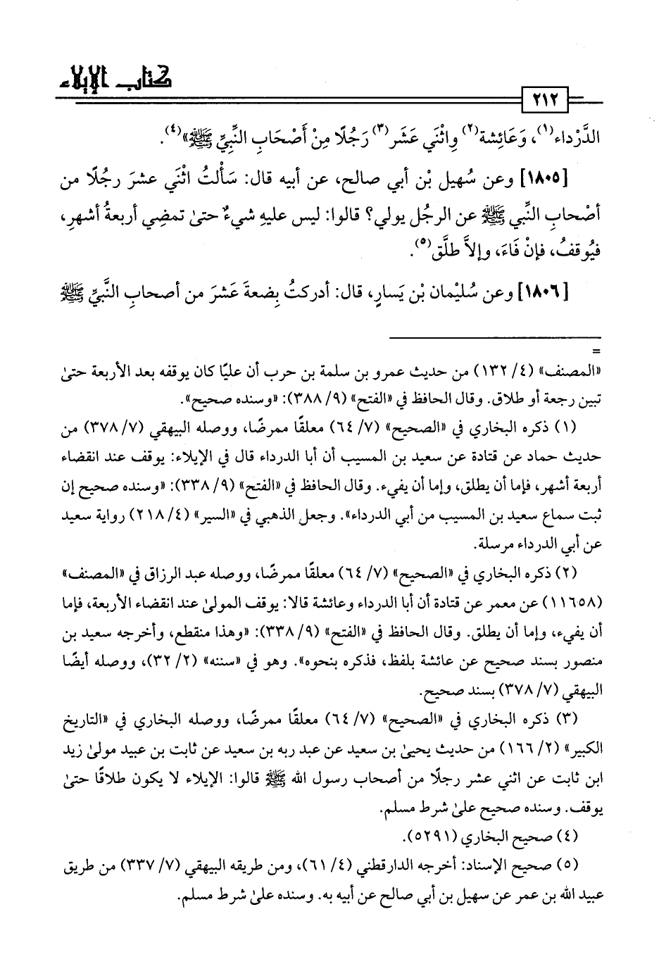 [1805] وعن سُهيل بن أبي صالح، عن أبيه قال: سَأْلتُ اثْنَي عشرَ رجُلًا من أصْحابِ النَّبي -صلى اللَّه عليه وسلم- عن الرجُل يولي؟ قالوا: ليس عليهِ شيءٌ حتى تمضِي أربعةُ أشهرِ، فيُوقفُ، فإنْ فَاءَ، وإلَّا طلَّق (¬5).