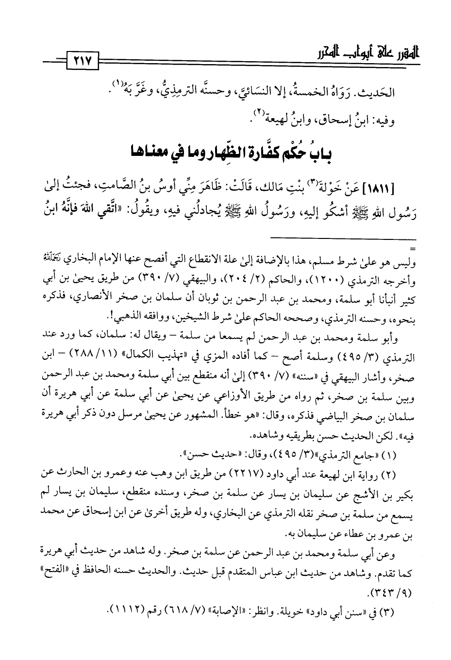 (¬2) رواية ابن لهيعة عند أبي داود (2217) من طريق ابن وهب عنه وعمرو بن الحارث عن بكير بن الأشج عن سليمان بن يسار عن سلمة بن صخر، وسنده منقطع، سليمان بن يسار لم يسمع من سلمة بن صخر نقله الترمذي عن البخاري، وله طريق أخرى عن ابن إسحاق عن محمد بن عمرو بن عطاء عن سليمان به.