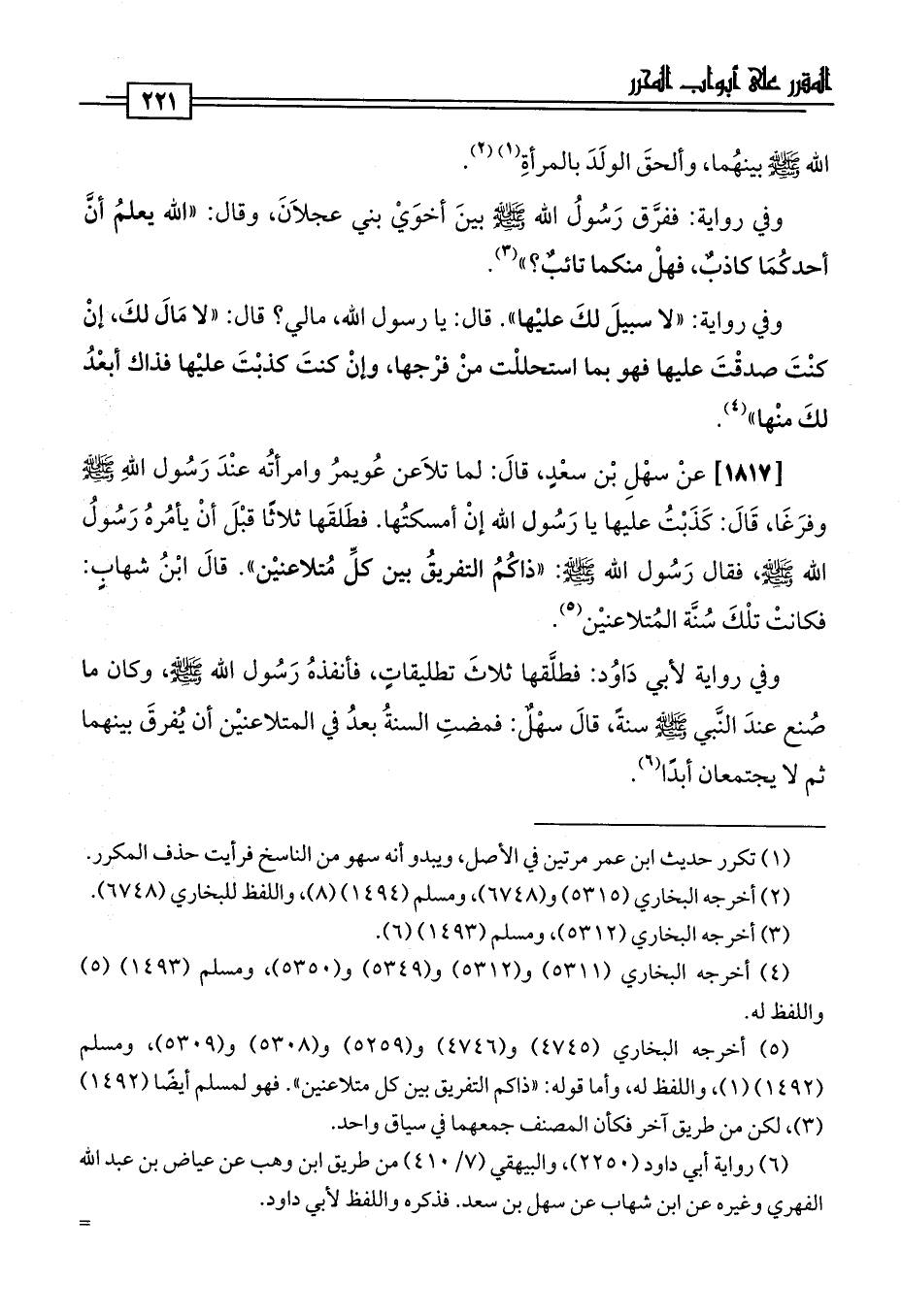 (¬5) أخرجه البخاري (4745) و (4746) و (5259) و (5308) و (5309)، ومسلم (1492) (1)، واللفظ له، وأما قوله: "ذاكم التفريق بين كل متلاعنين". فهو لمسلم أيضًا (1492) (3)، لكن من طريق آخر فكأن المصنف جمعهما في سياق واحد.