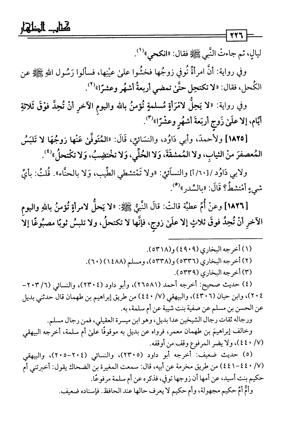 (¬5) حديث ضعيف: أخرجه أبو داود (2305)، والنسائي (204 - 205)، والبيهقي (7/ 440 - 441) من طريق مخرمة عن أبيه، قال: سمعت المغيرة بن الضحاك يقول: أخبرتني أم حكيم بنت أسيد، عن أمها أن زوجها توفي، فذكره عن أم سلمة مرفوعًا.